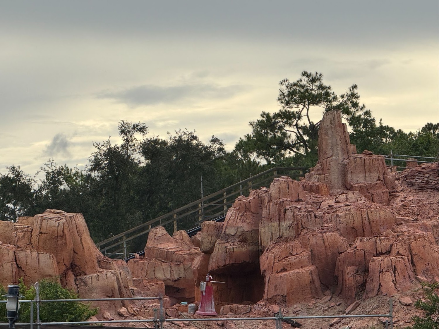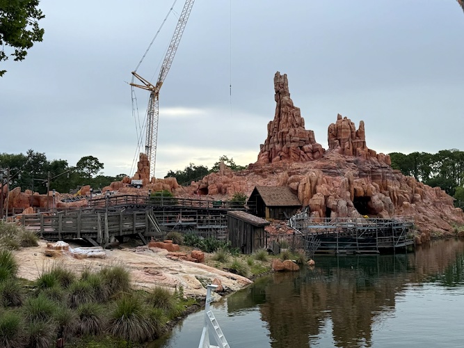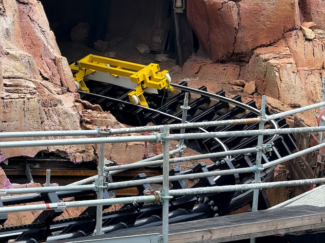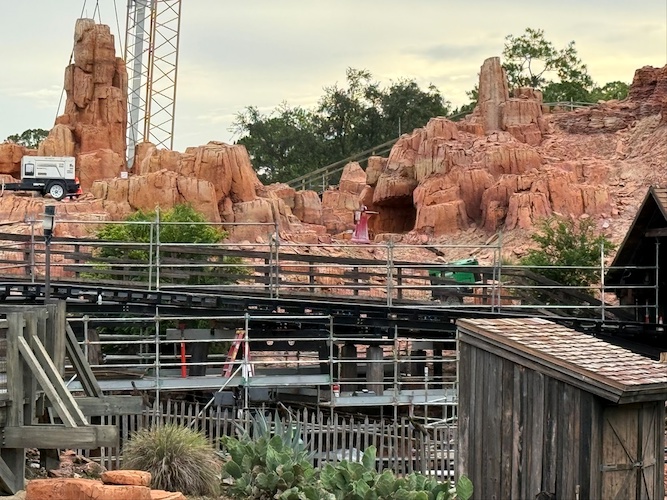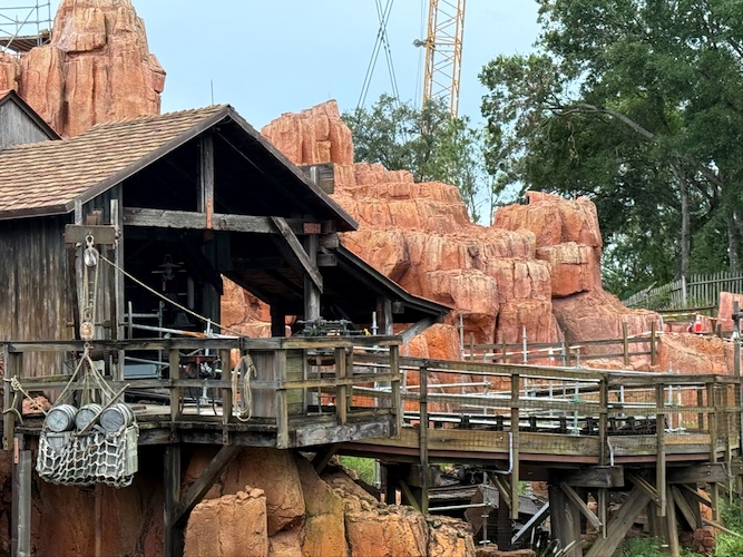 - Throughout the rest of the attraction, scaffolding still covers many areas of the ride. The large crane also still towers over the Frontierland thrill ride.