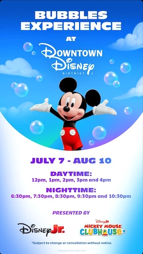 - A special “Bubbles Experience" is on its way to the Downtown Disney District at the Disneyland Resort, which will take place multiple times daily - presented by Disney Jr. and the new series, Mickey Mouse Clubhouse+.