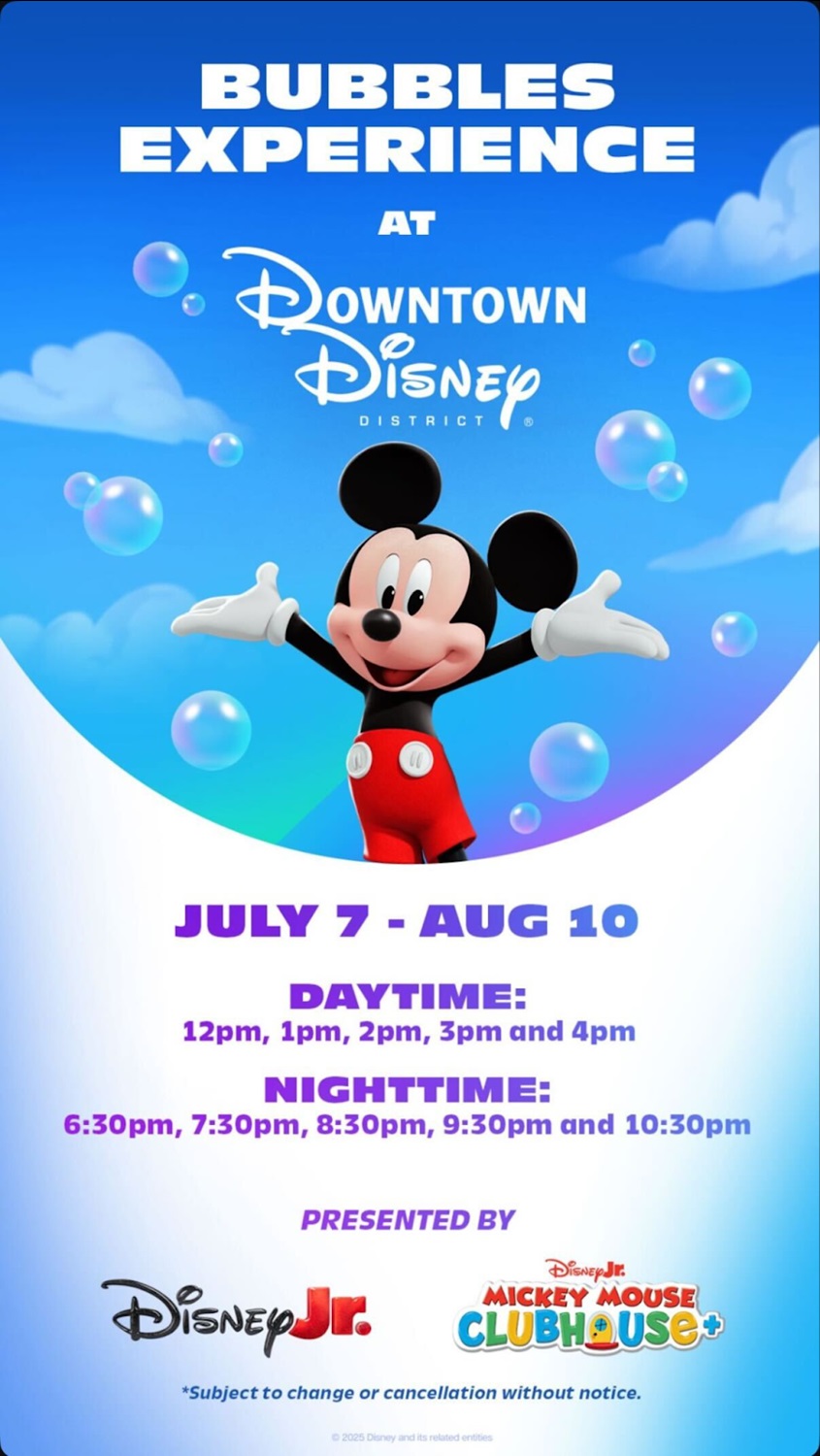 - A special “Bubbles Experience" is on its way to the Downtown Disney District at the Disneyland Resort, which will take place multiple times daily - presented by Disney Jr. and the new series, Mickey Mouse Clubhouse+.