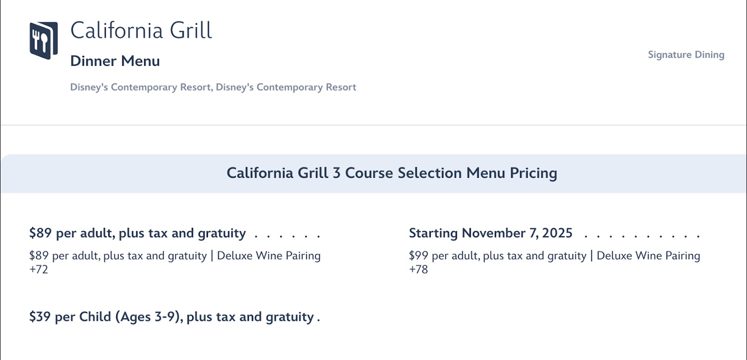 - Starting November 7, 2025, the elevated California Grill dining experience comes at a slightly higher ticket.
