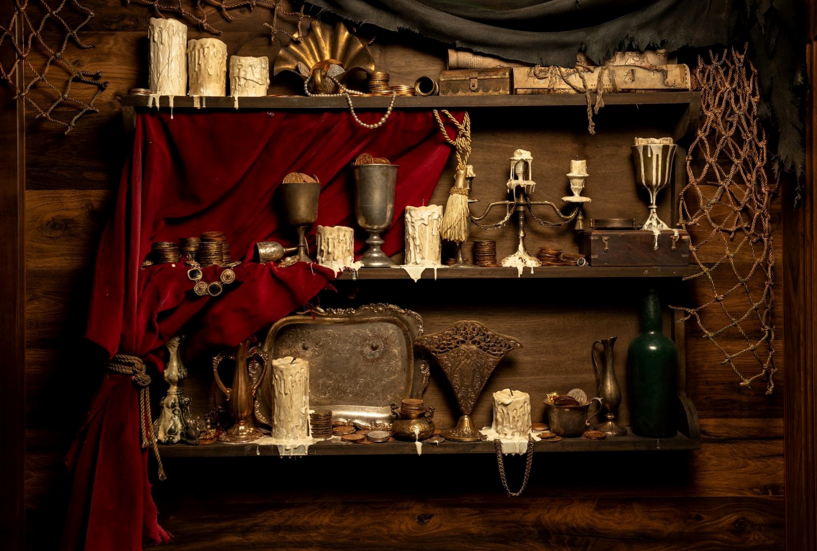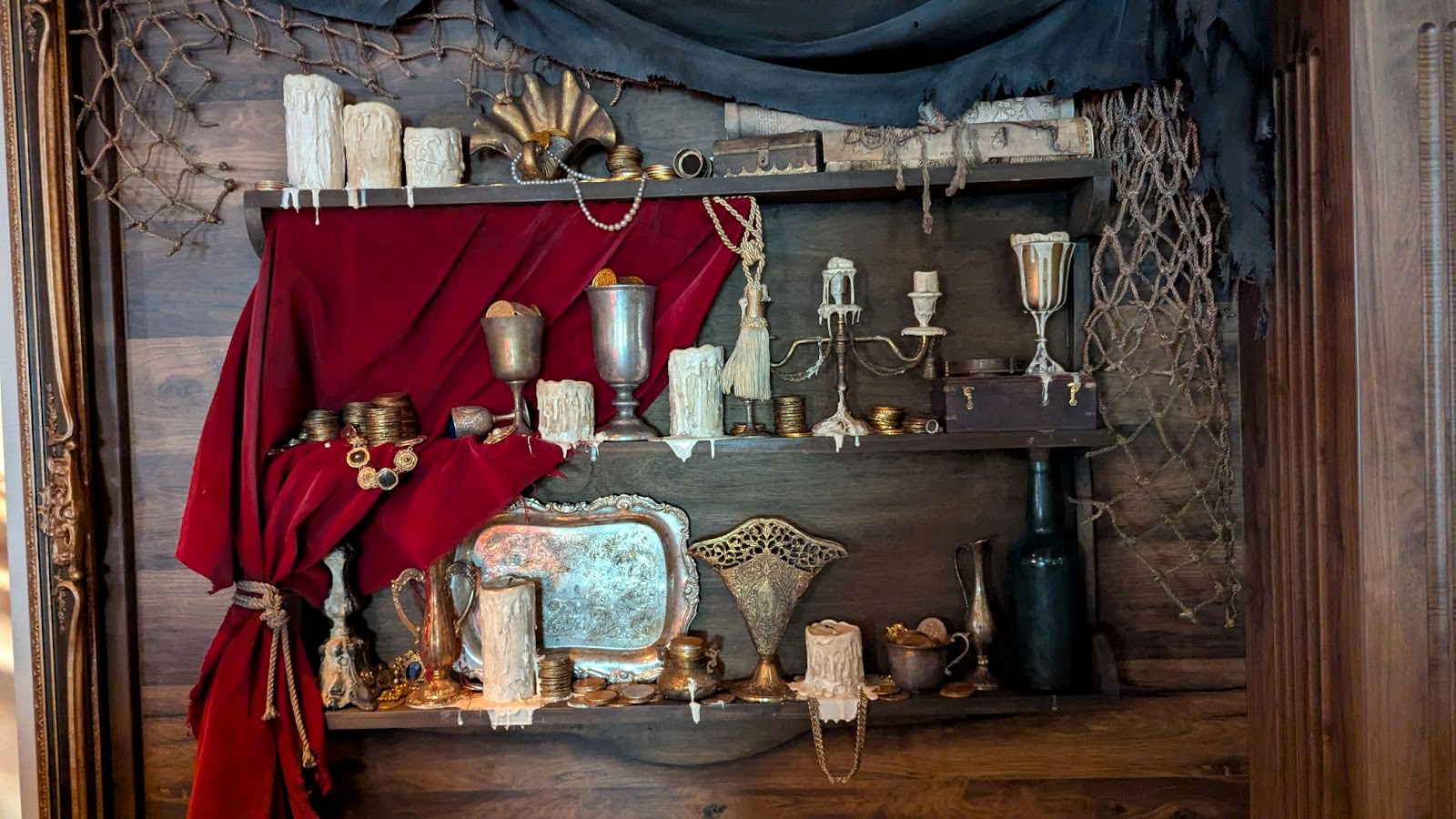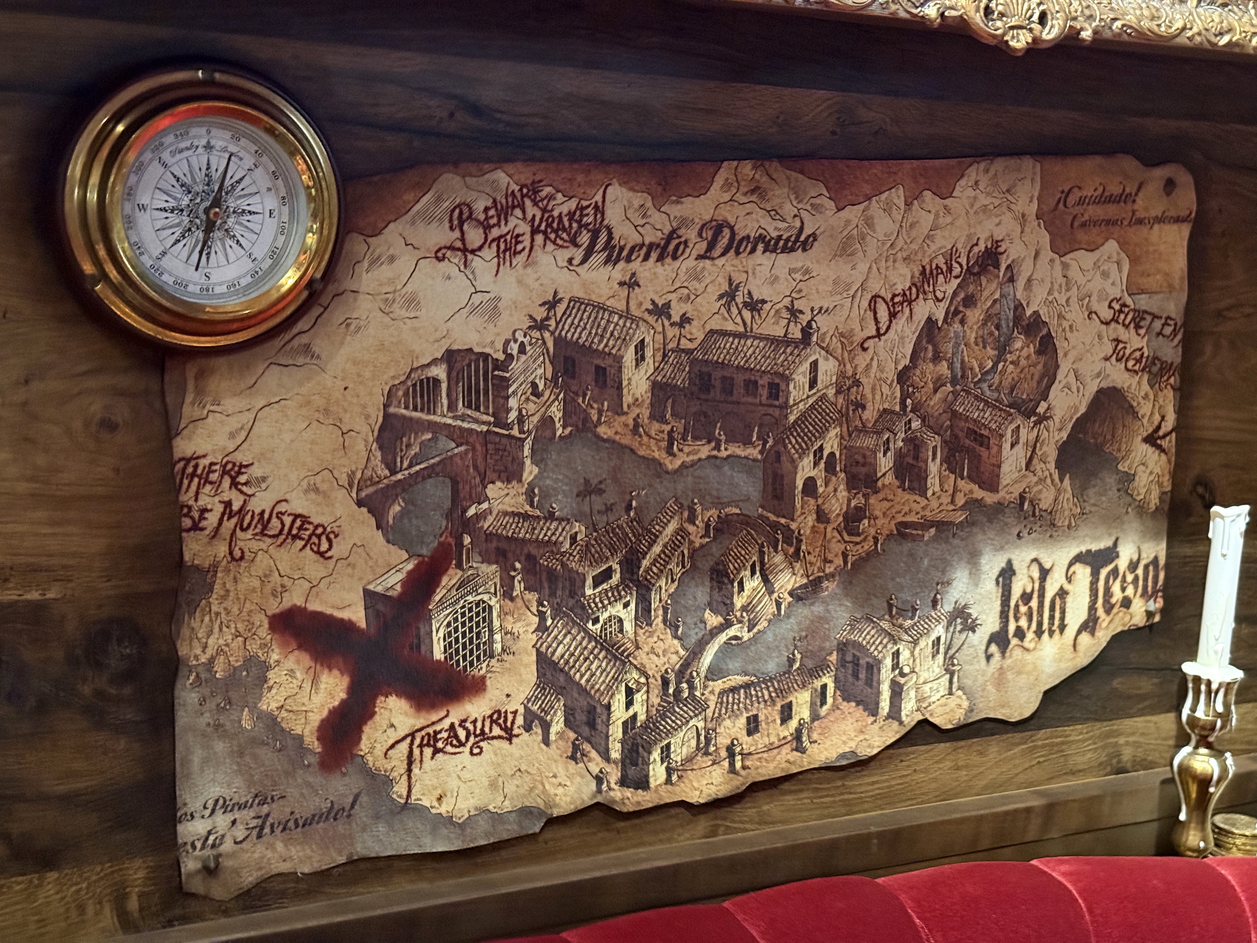 - A set of 13 drawers can be found, each labeled with different scenes representing the global Pirates attractions, including The Ghostly Grotto, Port Royale, Talking Skull Bay, Blue Bayou, and Treasure Cove.