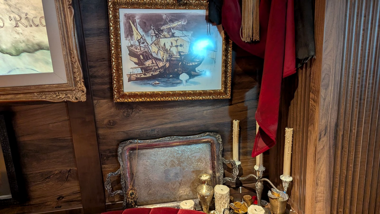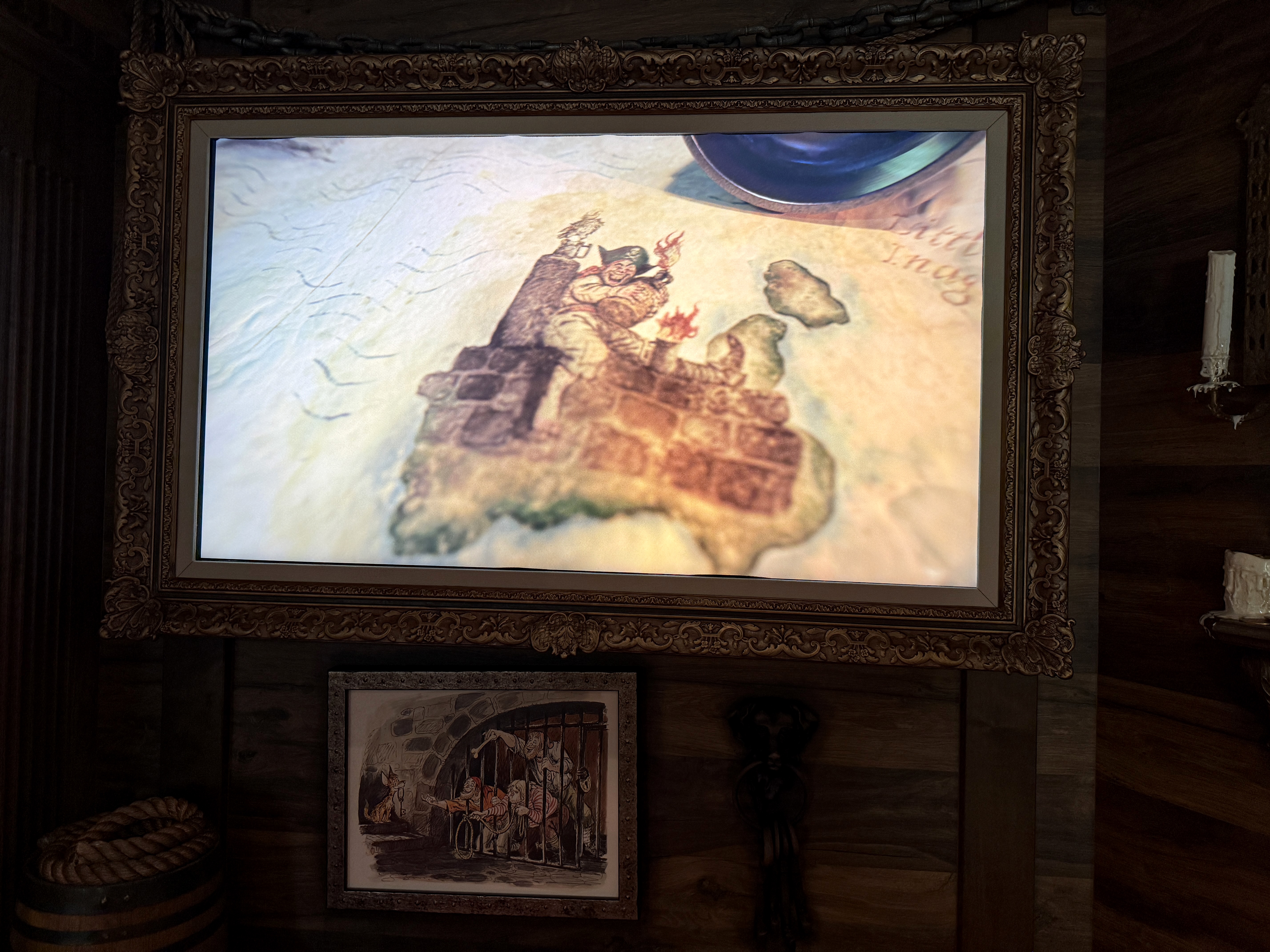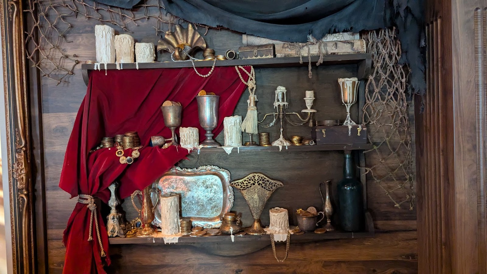 - A set of 13 drawers can be found, each labeled with different scenes representing the global Pirates attractions, including The Ghostly Grotto, Port Royale, Talking Skull Bay, Blue Bayou, and Treasure Cove.