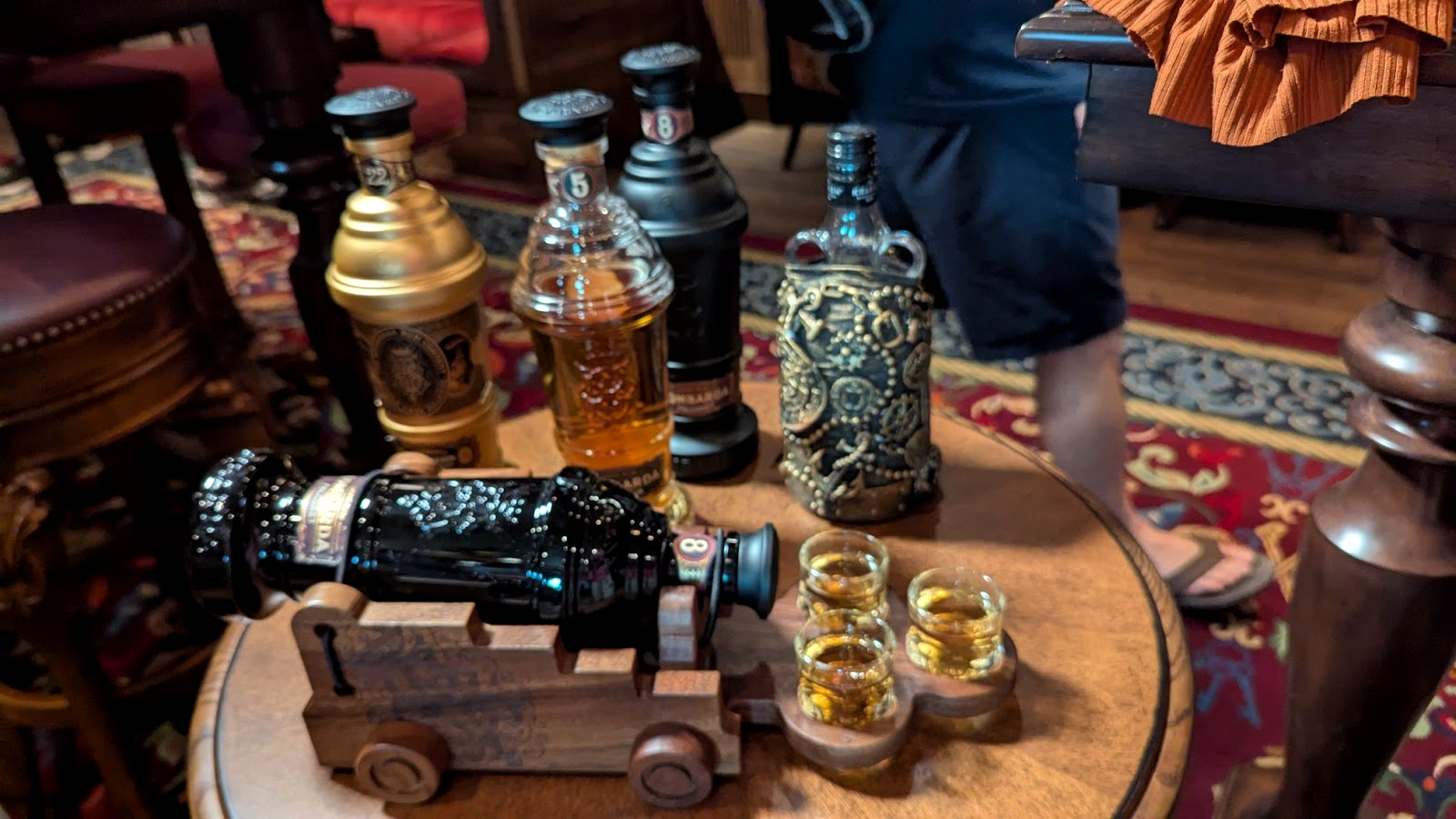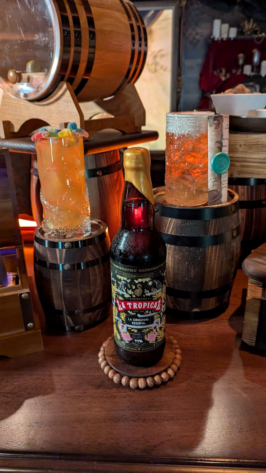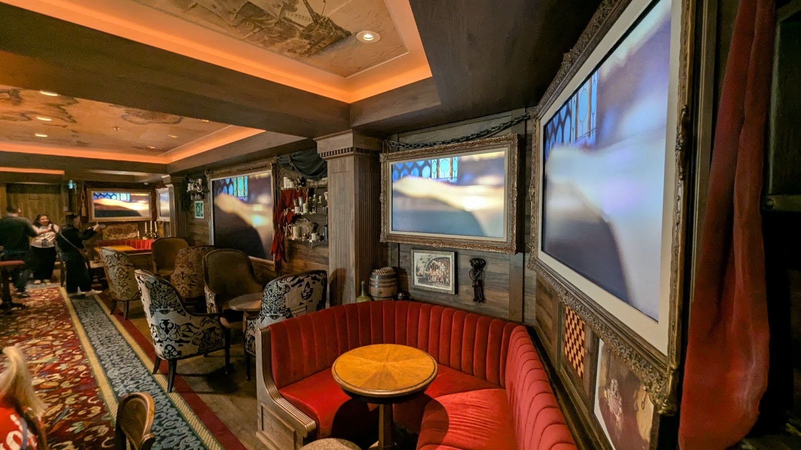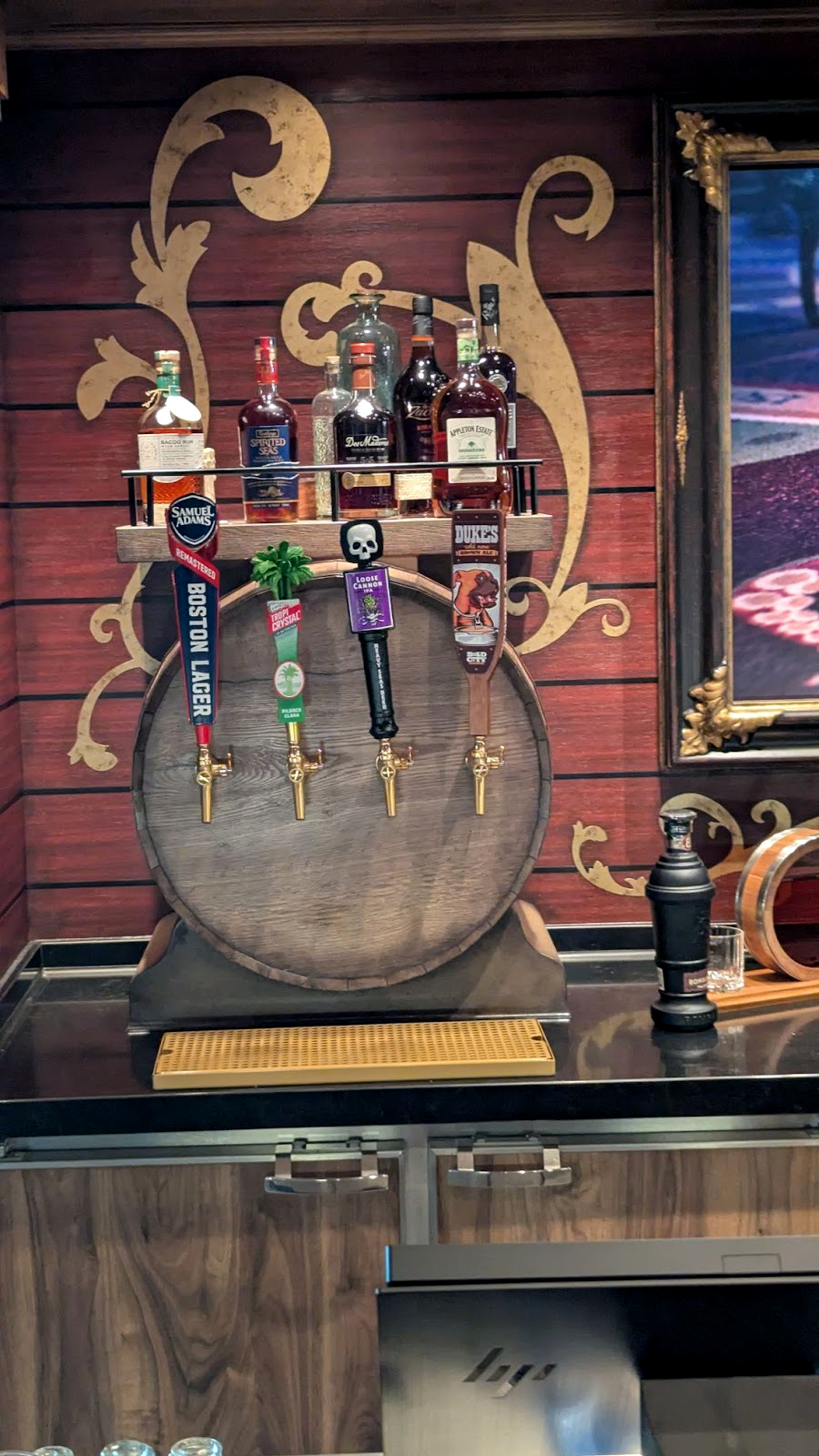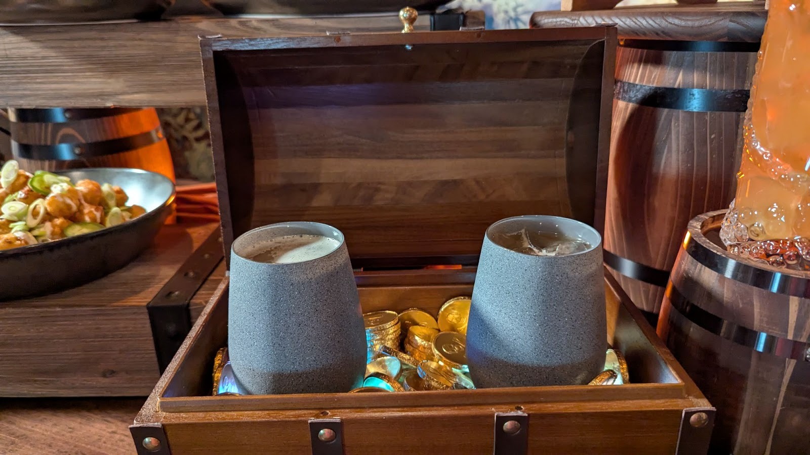 - A bar front constructed from stacked treasure chests, nodding to the treasure rooms in the films and attractions.