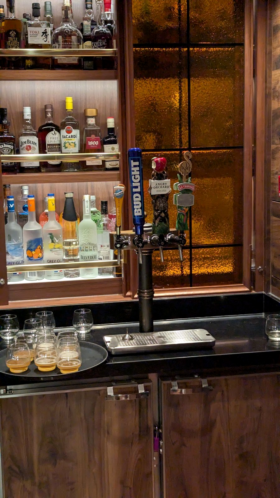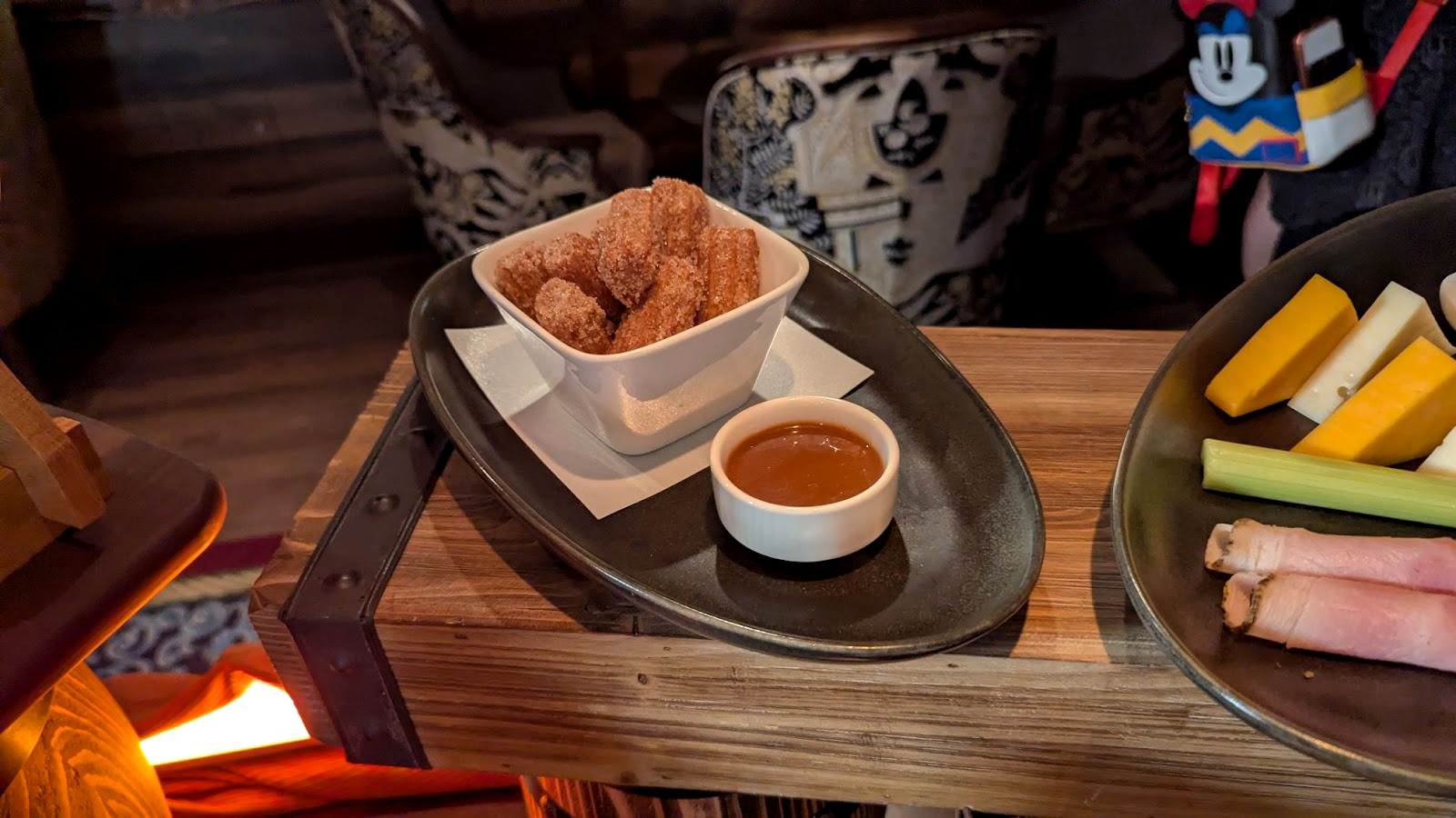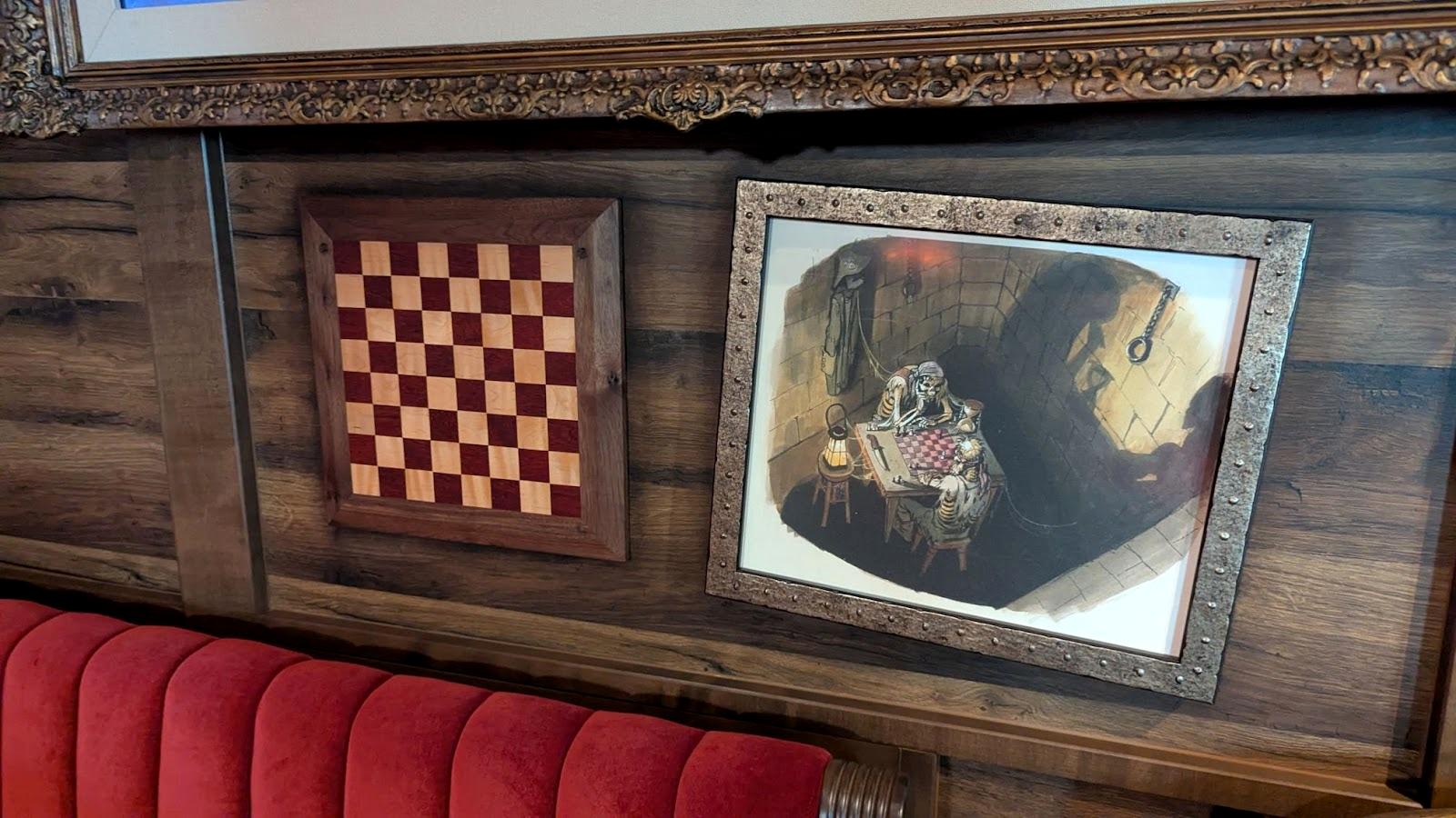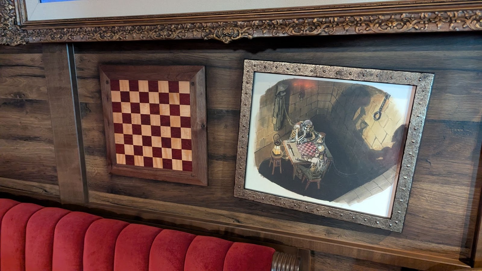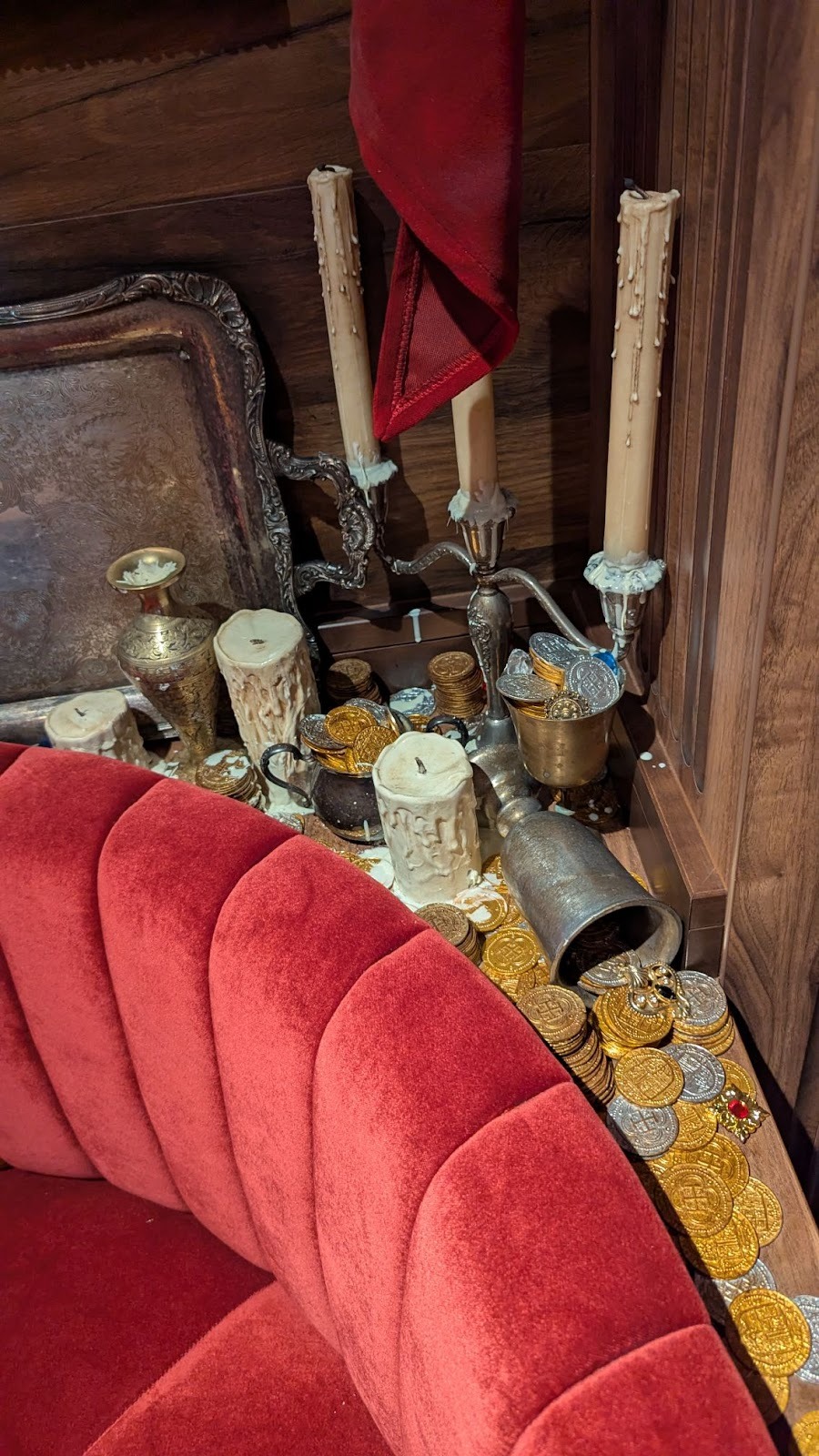 - A bar front constructed from stacked treasure chests, nodding to the treasure rooms in the films and attractions.