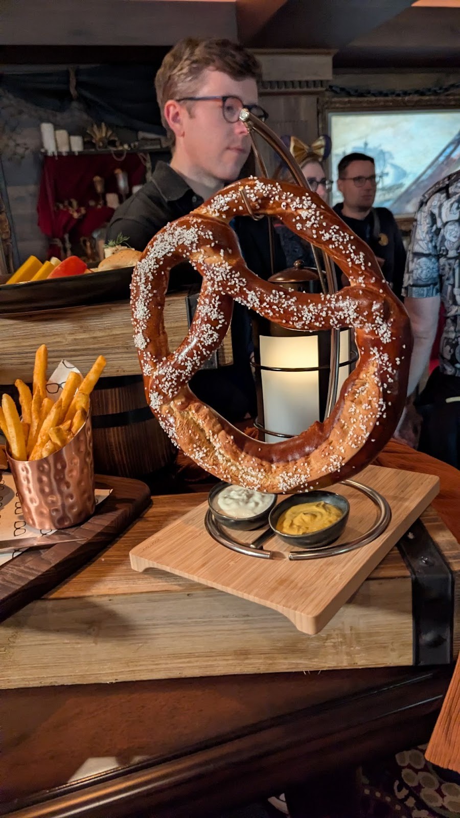 - A giant Bavarian Pretzel baked soft on the inside, Crispy on the outside and Salted. Served with German Mustard and Beer Cheese