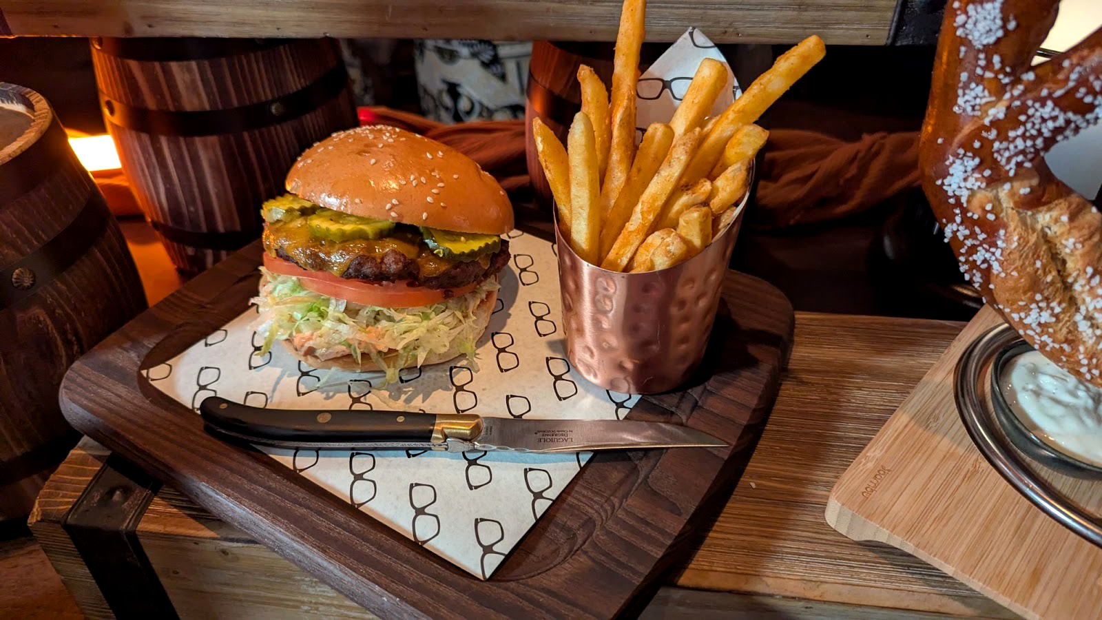 - Hand Crafted Brisket Burger, Tomato, Shredded Iceberg Lettuce, Pickles and American Cheese on Toasted Sesame Seed Potato Bun, with Crisp French Fries and Kewpie Ketchup