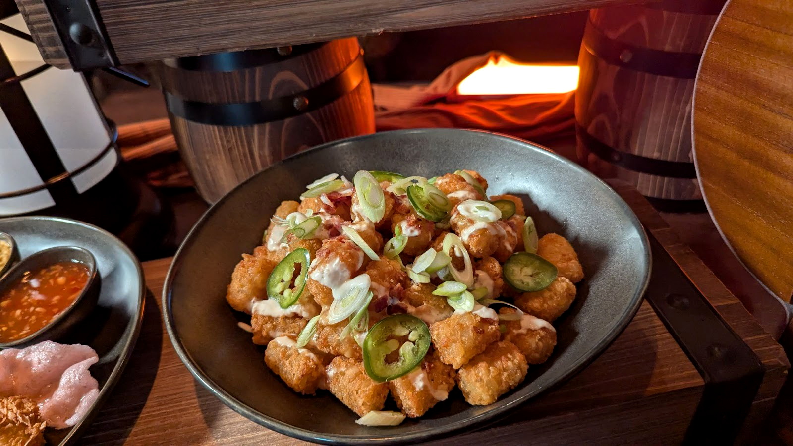 - Fried Potato Puffs topped with Nacho Cheese, Jalapeños, Crisp Bacon, Scallions, and Sour Cream