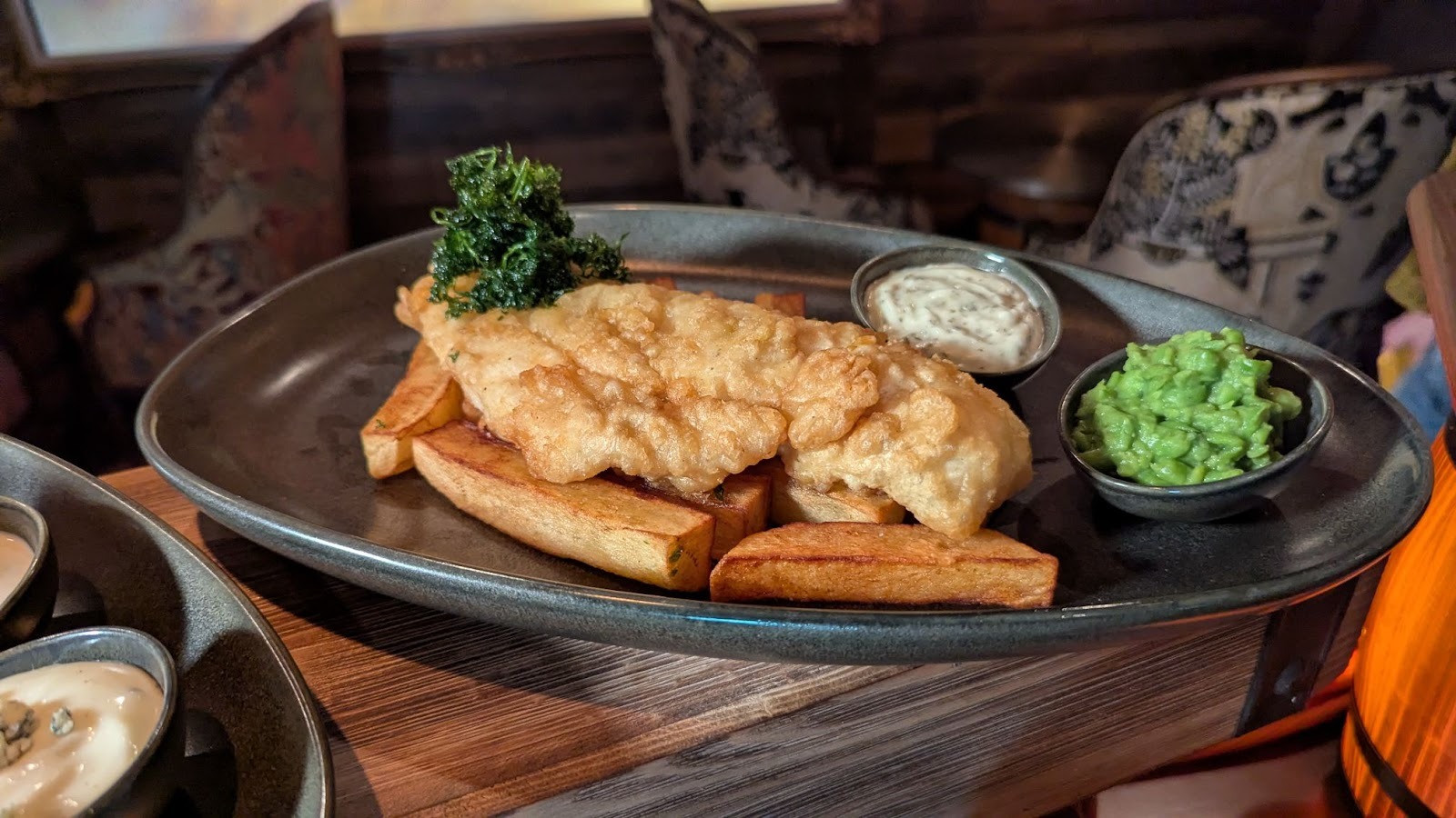 - Beer-battered Haddock Filet with Double-fried Potatoes and mushy Peas served with Tartar Sauce and Malt Vinegar
