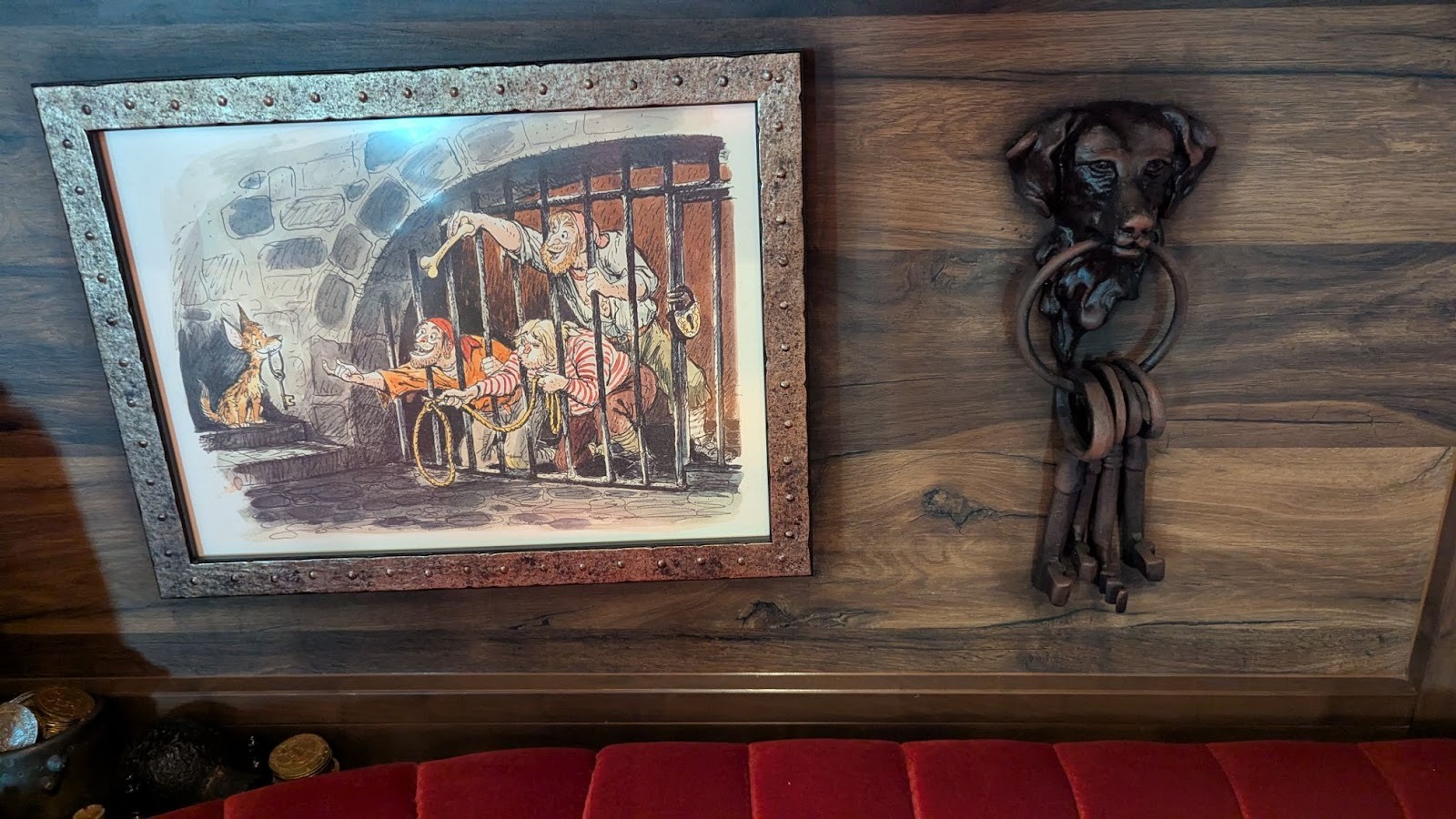 - Charred wooden carvings framing the portholes, a direct nod to the attraction's iconic "burning village" scene.