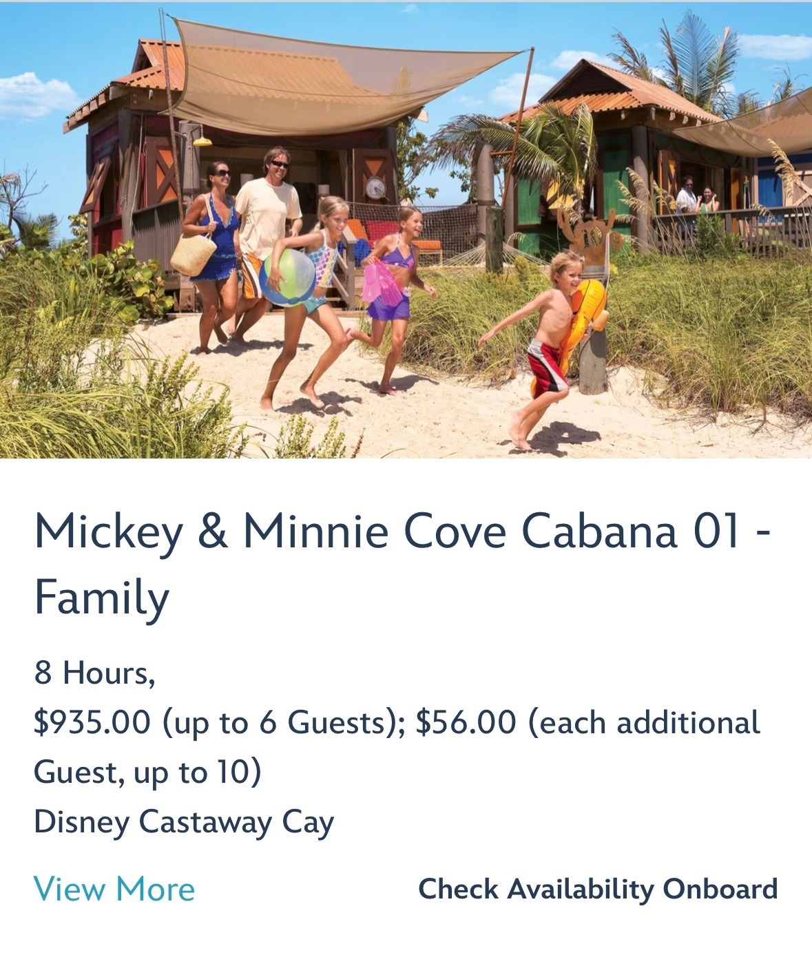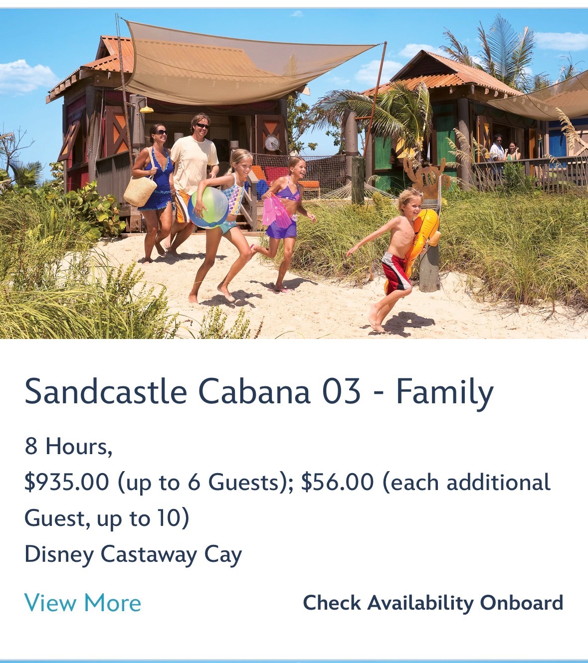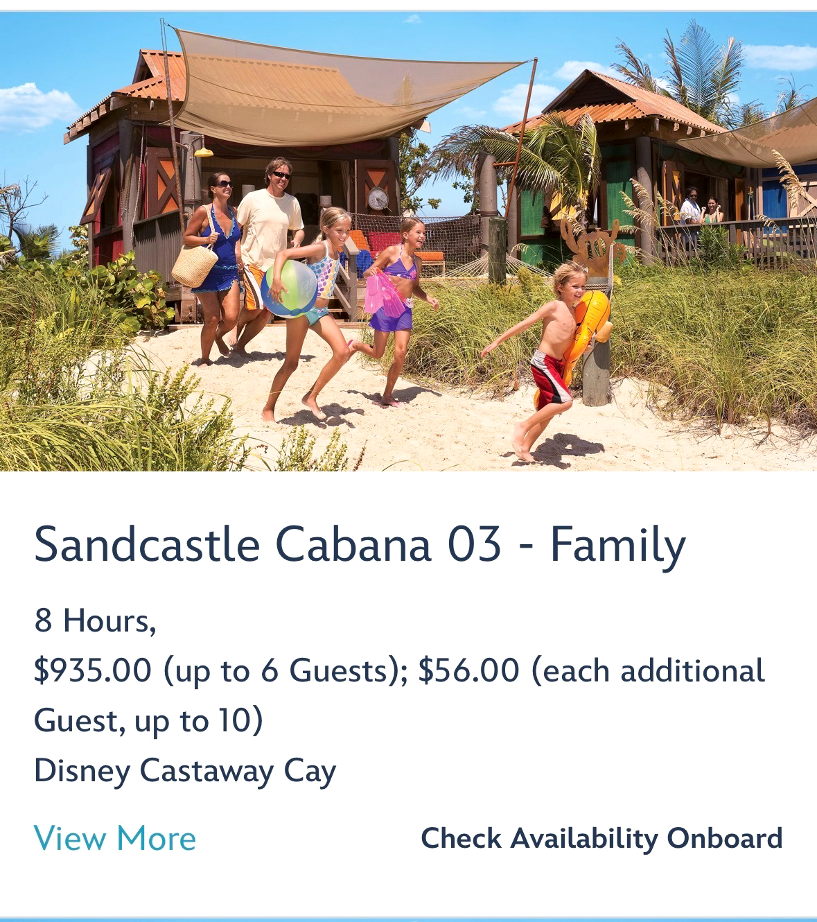 - The Family Beach Cabanas at the island now have a new name - “Sandcastle Cabanas”. Those looking to book a Sandcastle Cabana can now find them under that name under the My Cruise Activities / Port Adventures tab on the Disney Cruise Line app.