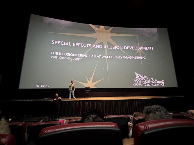When originally announced, the event was promised to feature a panel discussion from Walt Disney Imagineering, offering an inside look at “Illusioneering" in attractions like the Haunted Mansion at the Disney Parks. So while not quite a close examination of the iconic parks attraction, pictures on the event credential, banner on the website, and more all leaned into the Haunted Mansion idea. Those in attendance were treated to a TEDTalk of sorts from Imagineer/Illusioneer Daniel Joseph. While the name might not be immediately recognizable, a number of D23 Gold Members are sure to have seen him before in various media and at previous other D23 events, where his big claim to fame was figuring out how to make Disney Legend Yale Gracey’s original design for the Hatbox Ghost at Disneyland’s original Haunted Mansion work - later installed at the park for the 60th anniversary in 2015 before being duplicated at the Walt Disney World attraction in 2023.