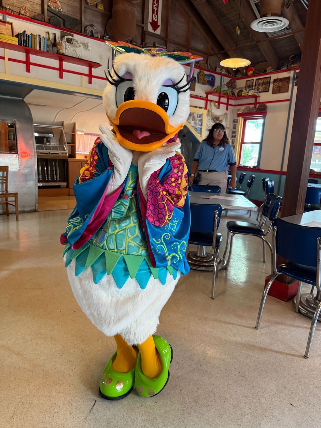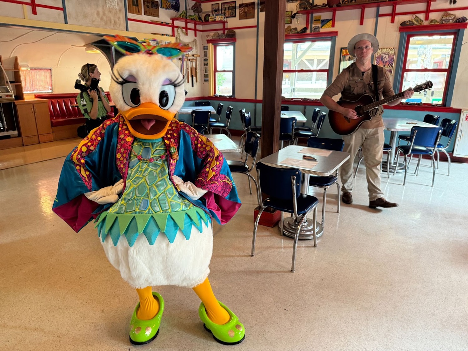 - Guests can now meet with Daisy Duck in her usual DinoLand attire inside the side room of the restaurant, and if you time it right, you might also get to hear some tunes played on the guitar by the Dino Institute Intern.