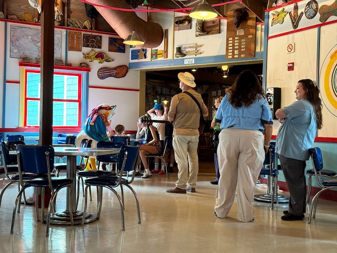 - Daisy and the Dino Institute Intern walk around the space interacting with guests in a setting reminiscent of a typical character dining experience.