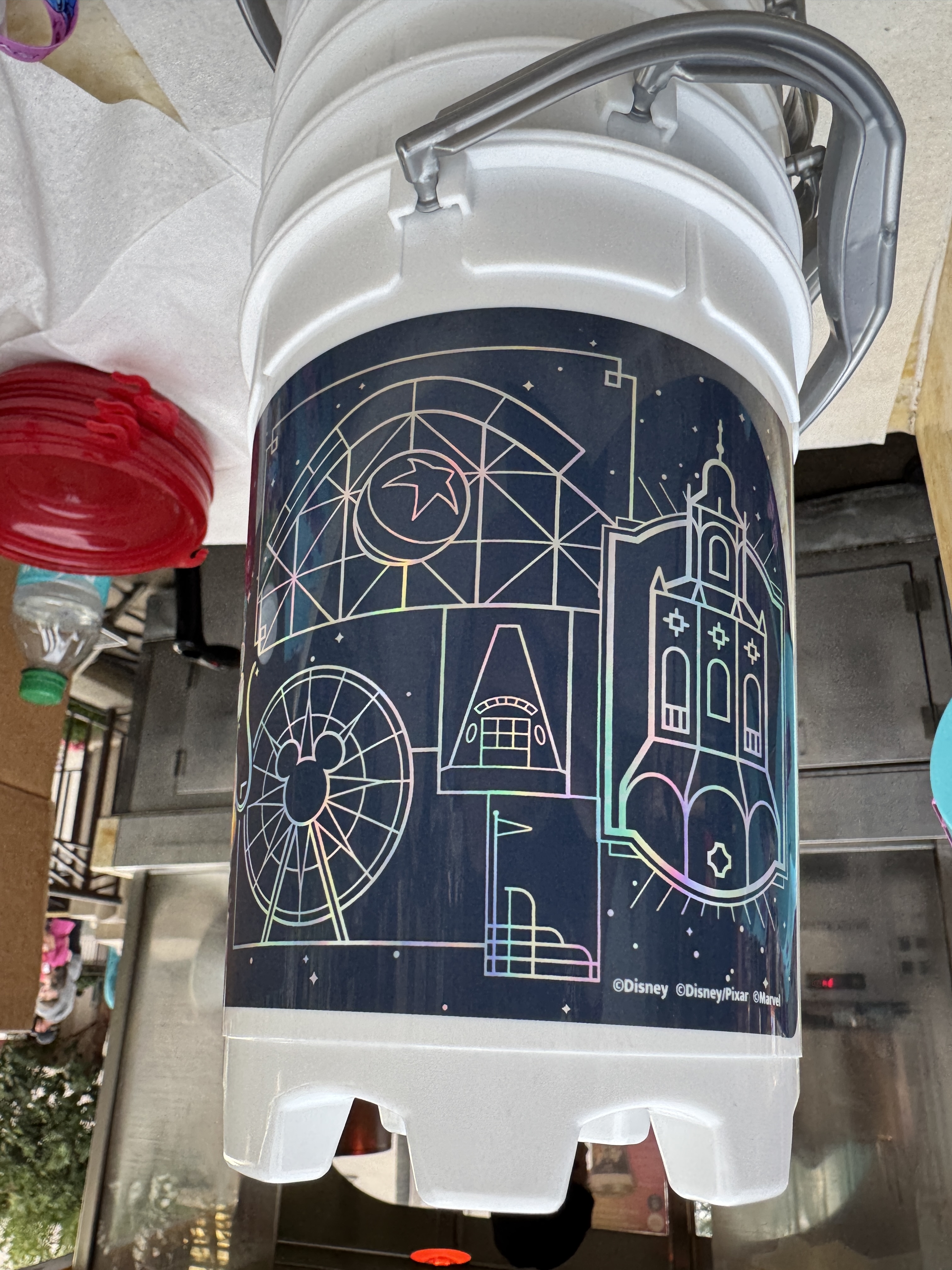 • The bucket features Mickey and Minnie in their newly created anniversary costumes on the front, alongside the DCA 25th logo.