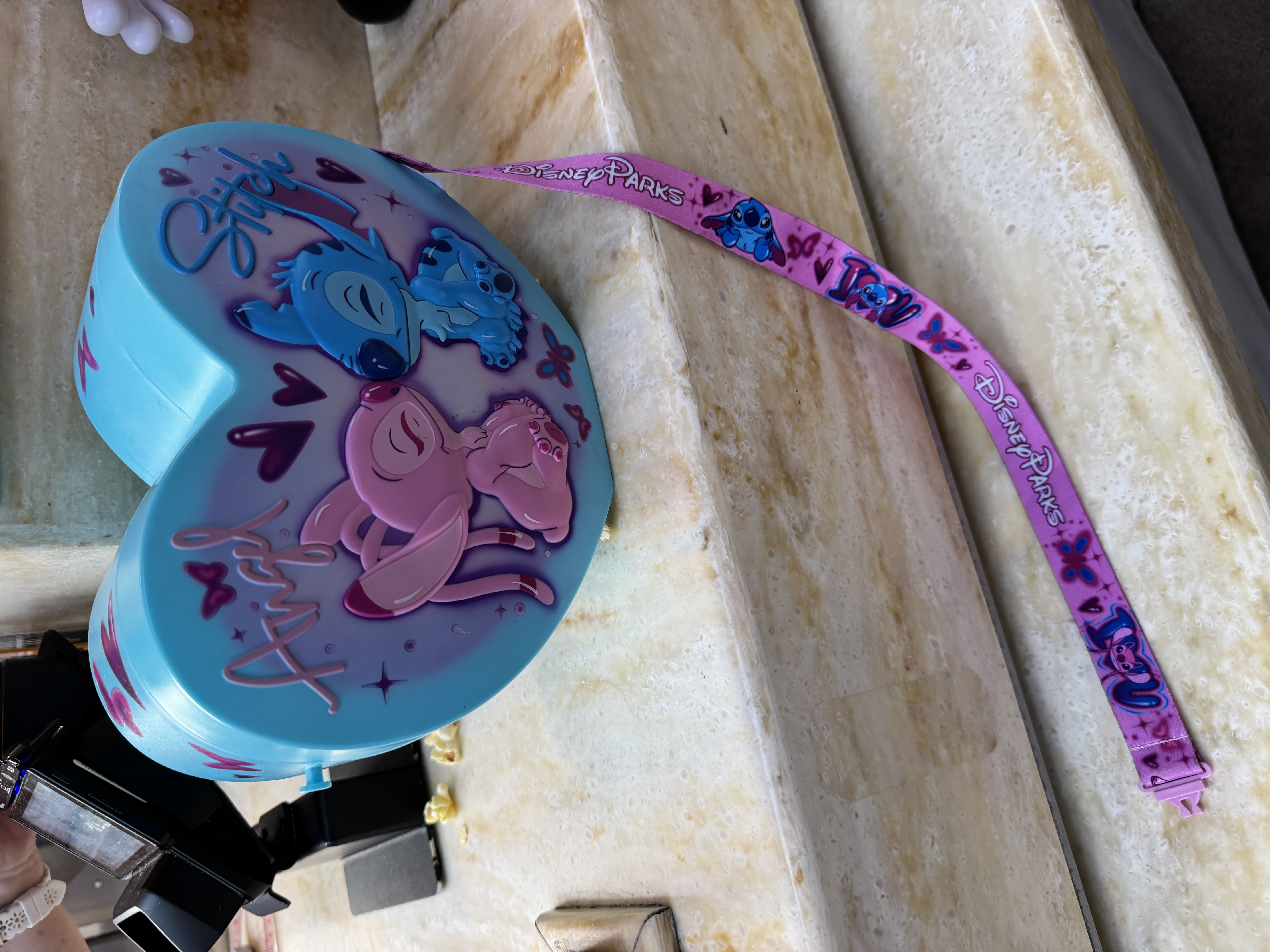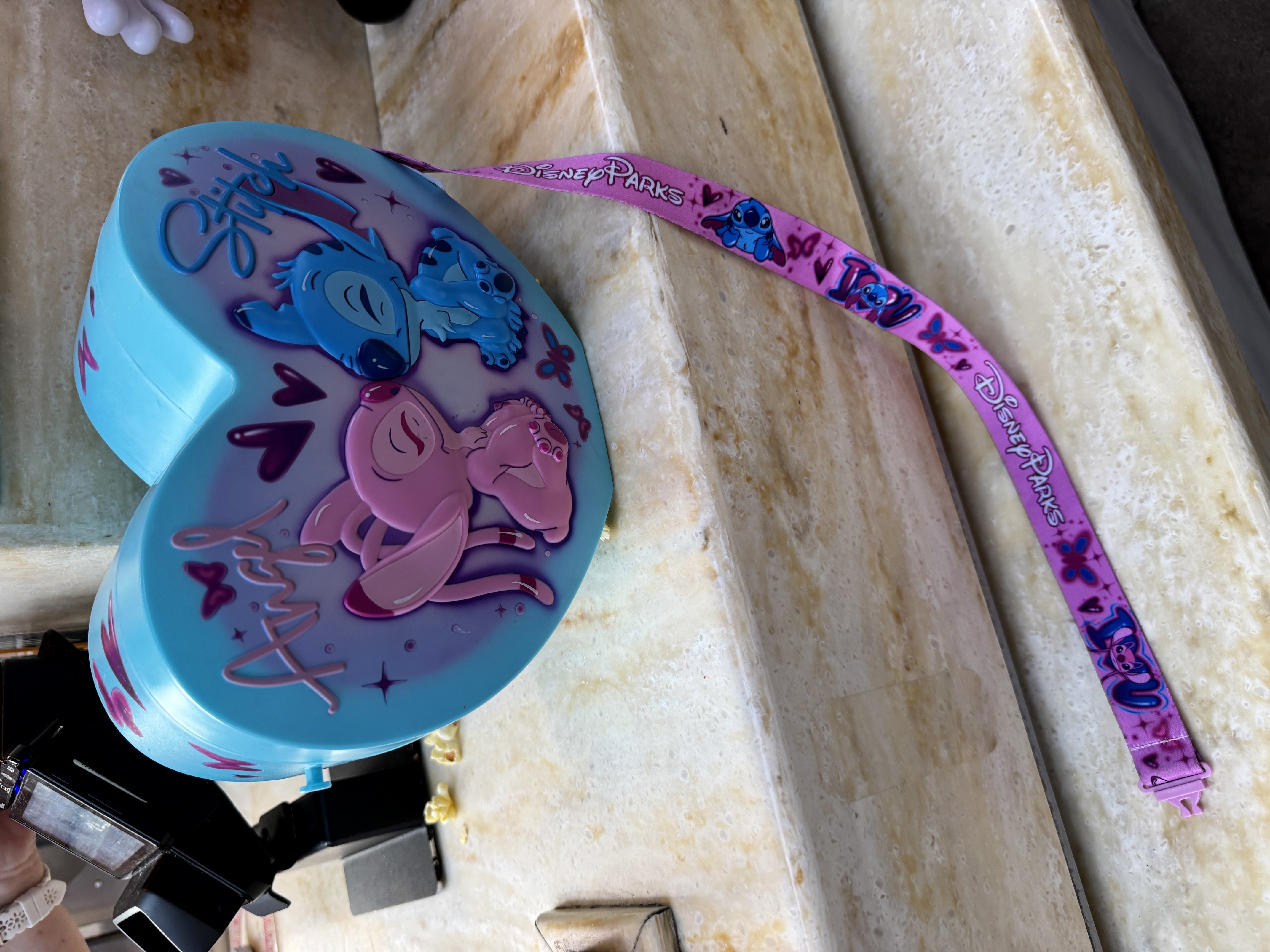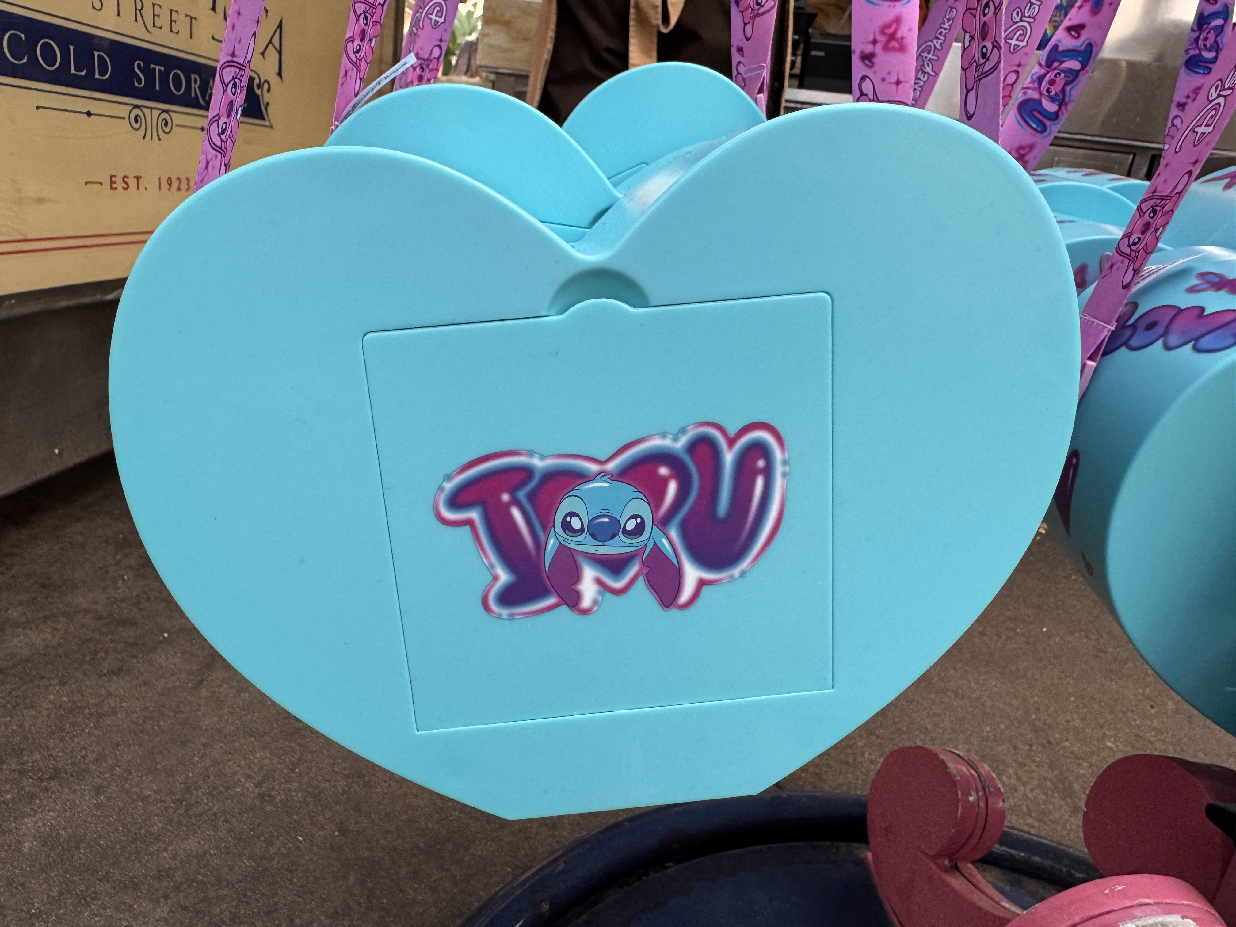 • The second new popcorn bucket is perfect for both fans of Lilo & Stitch and lovebirds, as Stitch and Angel feature prominently on this heart-shaped bucket.