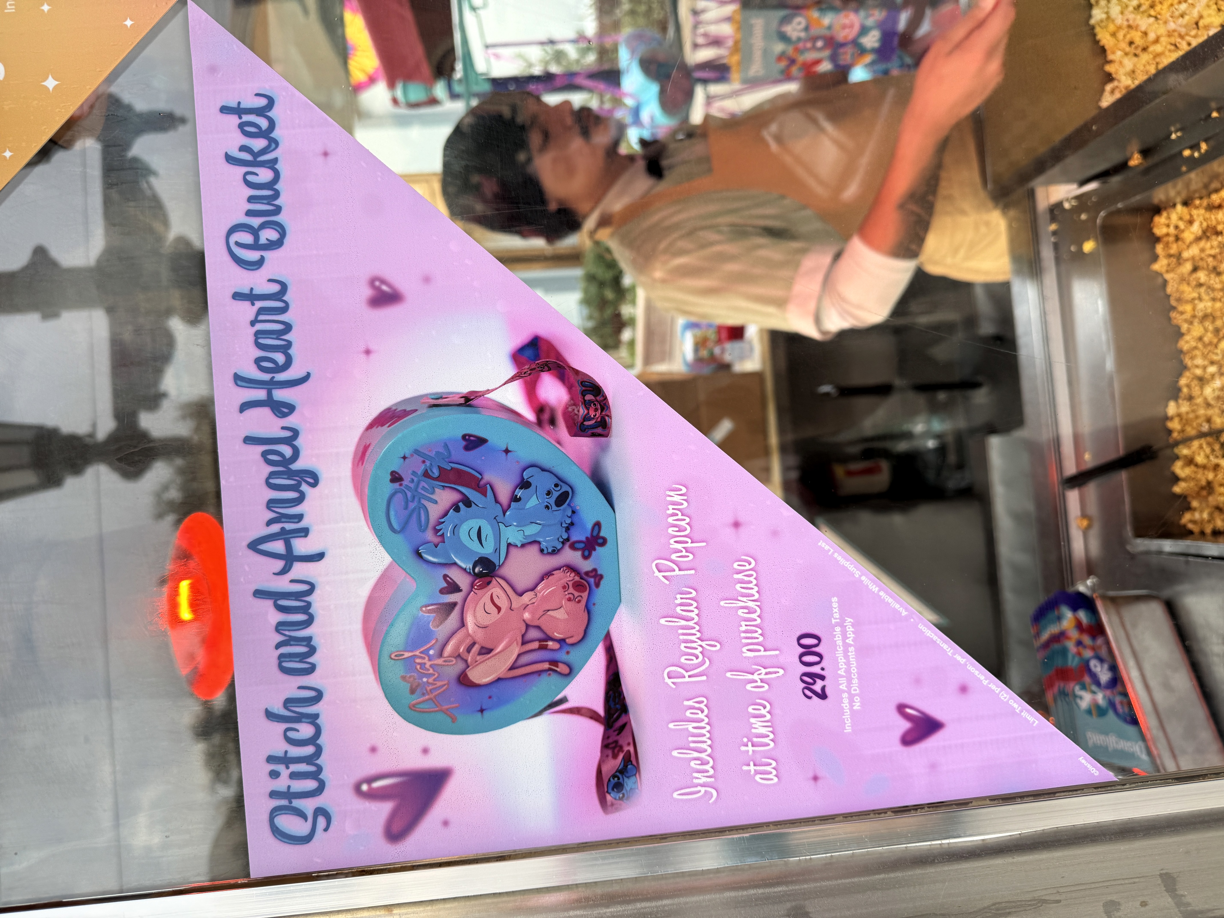 • The Stitch and Angel Heart Bucket retails for $29.00, with popcorn included at time of purchase.