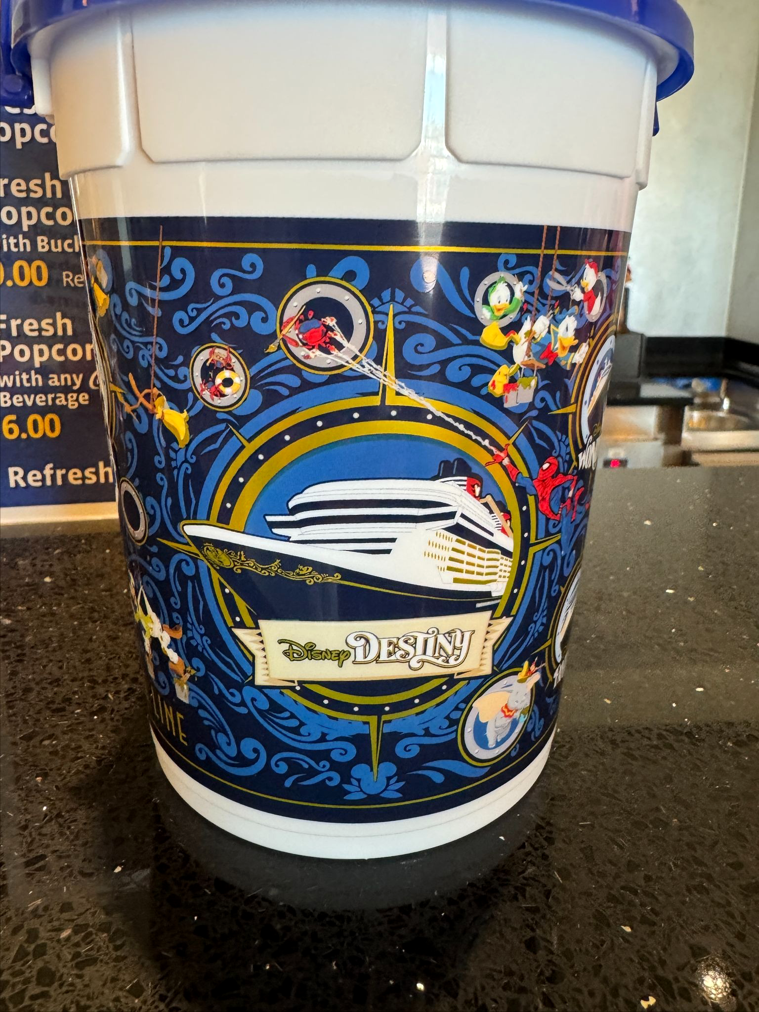 - Enjoying the at-sea fun, we spotted an exciting change to Disney Cruise Line’s souvenir popcorn buckets, welcoming in the newest ship in the DCL fleet.
