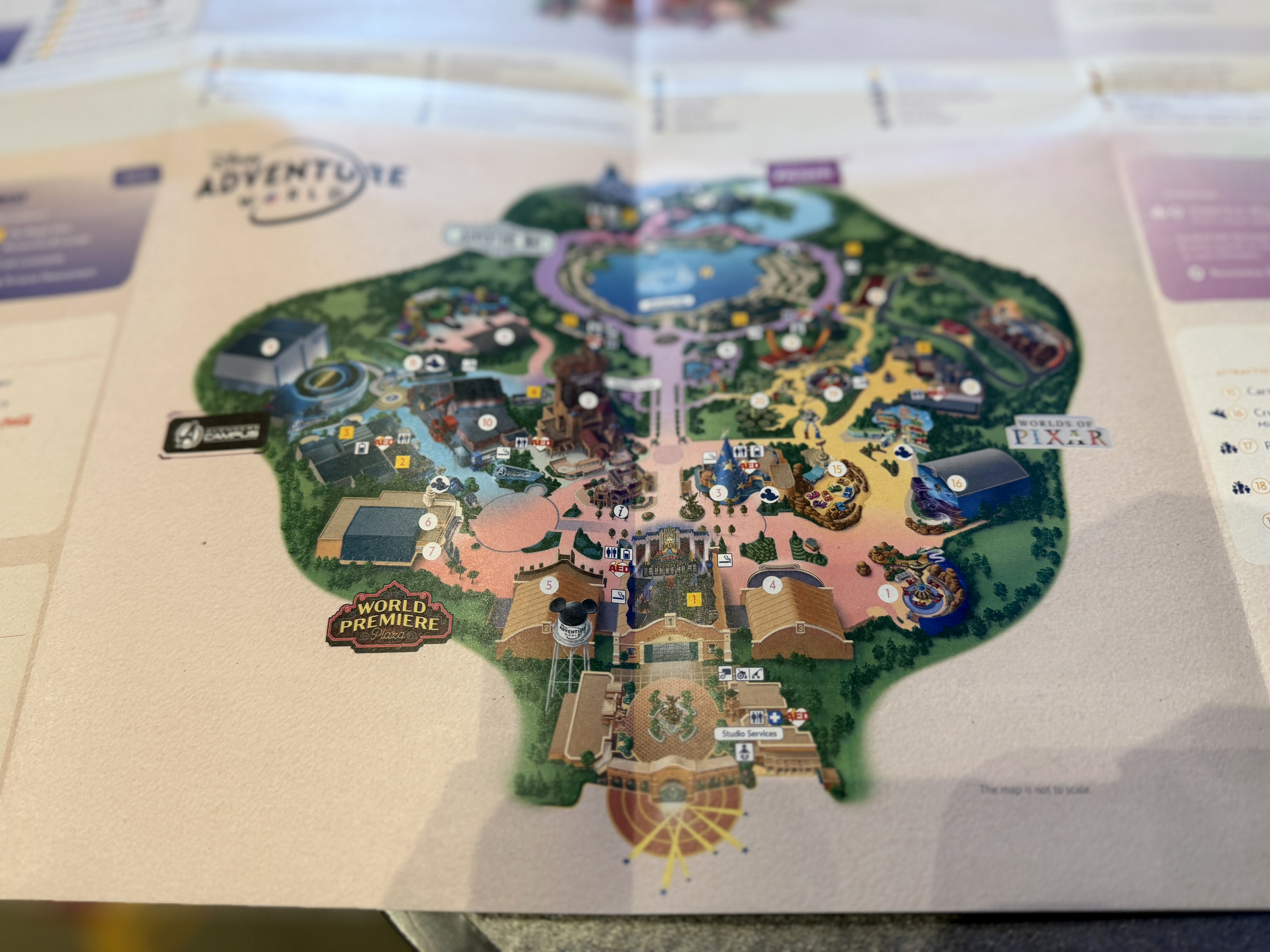 In the case of the side showcasing Disney Adventure World, we see the full and complete map of the park, including the new World of Frozen, Adventure Way, and Adventure Bay.