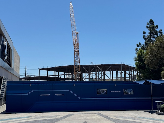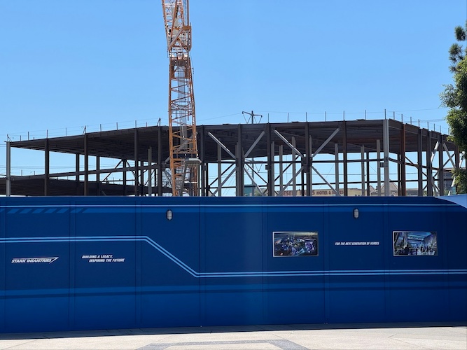 - From inside Avengers Campus, the skeleton of the new building towers behind the land, with a large crane on site as construction progresses.