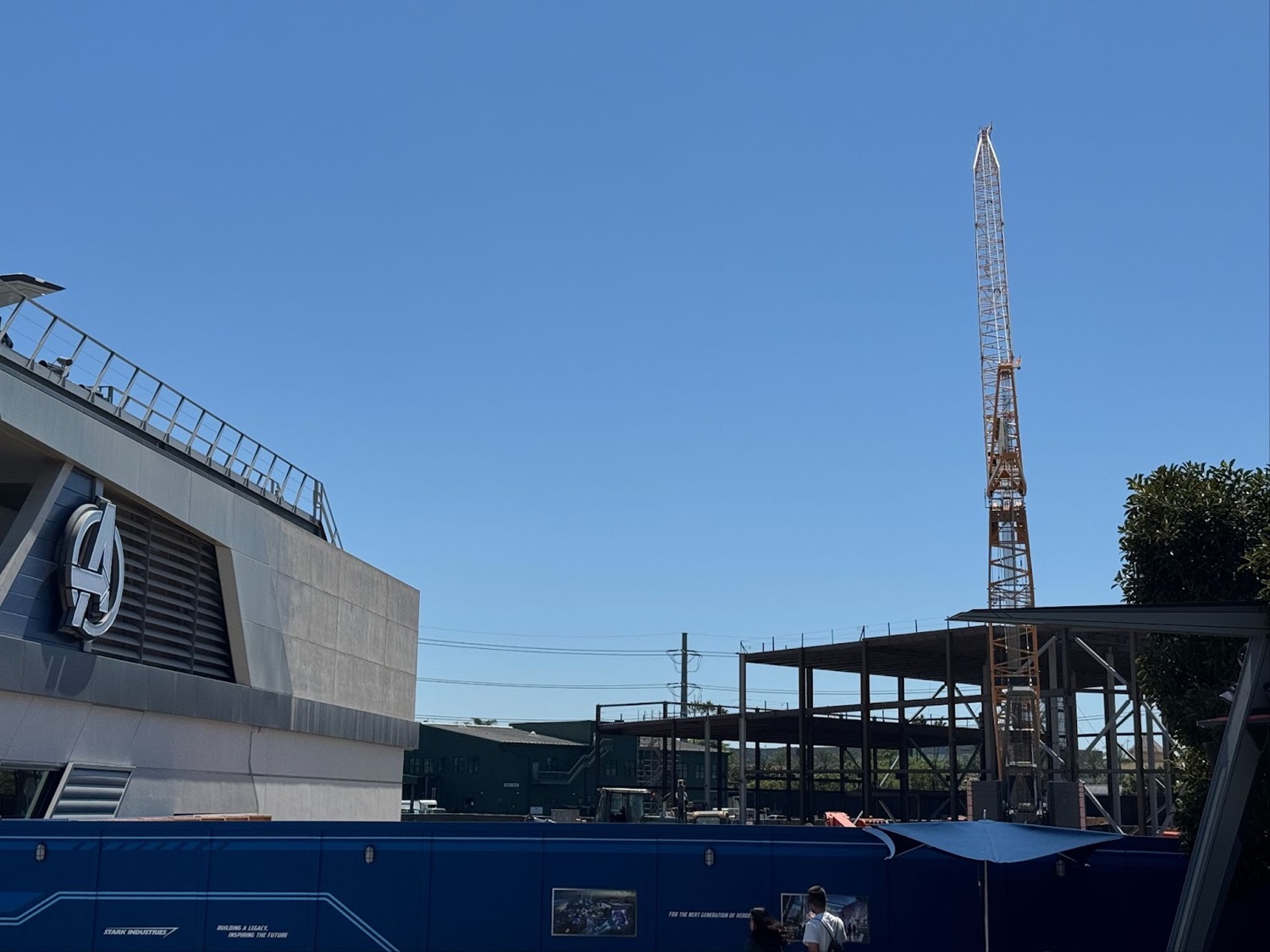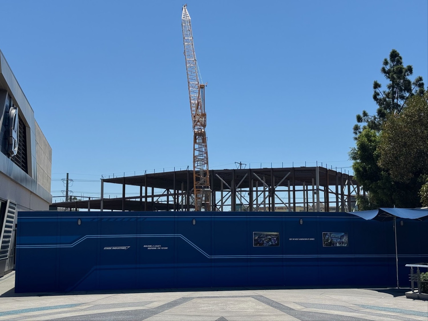 - From inside Avengers Campus, the skeleton of the new building towers behind the land, with a large crane on site as construction progresses.