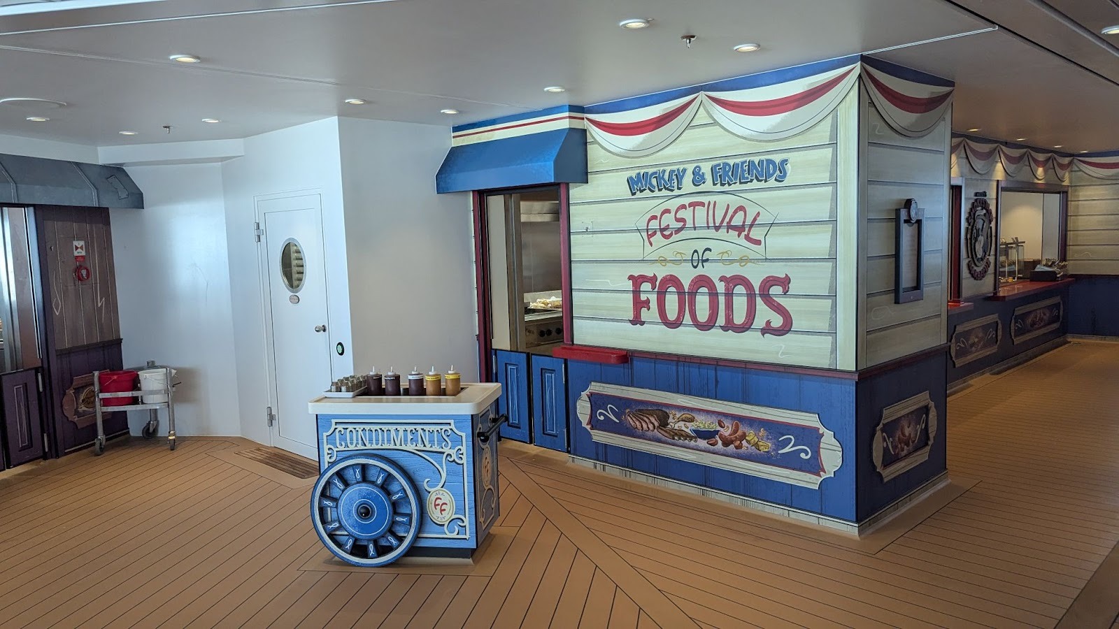 Available on the Wish Class ships of the Disney Cruise Line, which also includes the new Disney Destiny (sister of the Disney Wish and Disney Treasure) that just set off on her maiden voyage just a few days ago, is the Mickey and Friends Festival of Foods. This casual dining space is located just off the pool deck behind Funnel Vision on Deck 11.