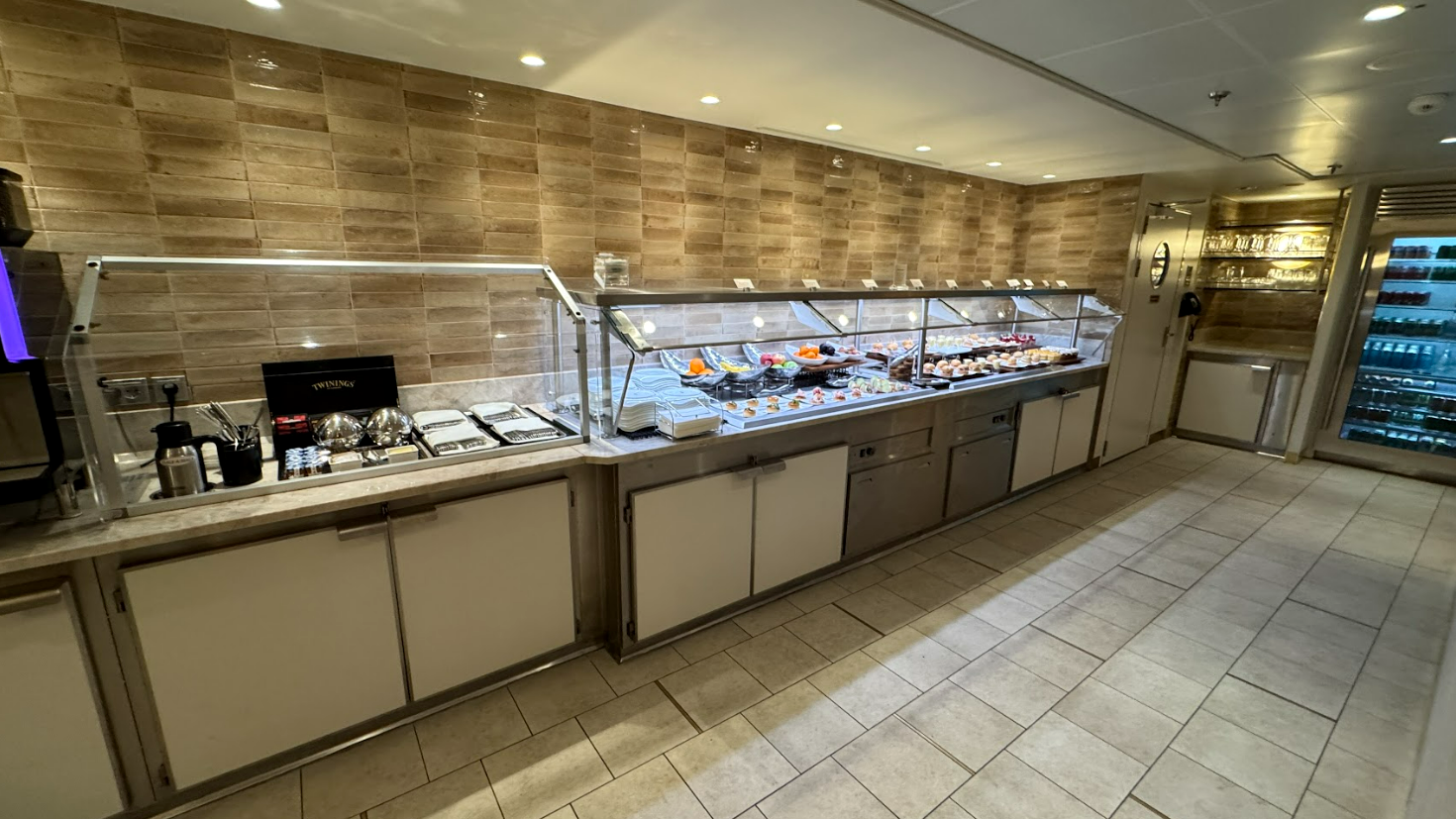 A marble-topped bar with gold accents serves cocktails during select hours, while a self-service buffet offers pastries, fruits, and charcuterie.
