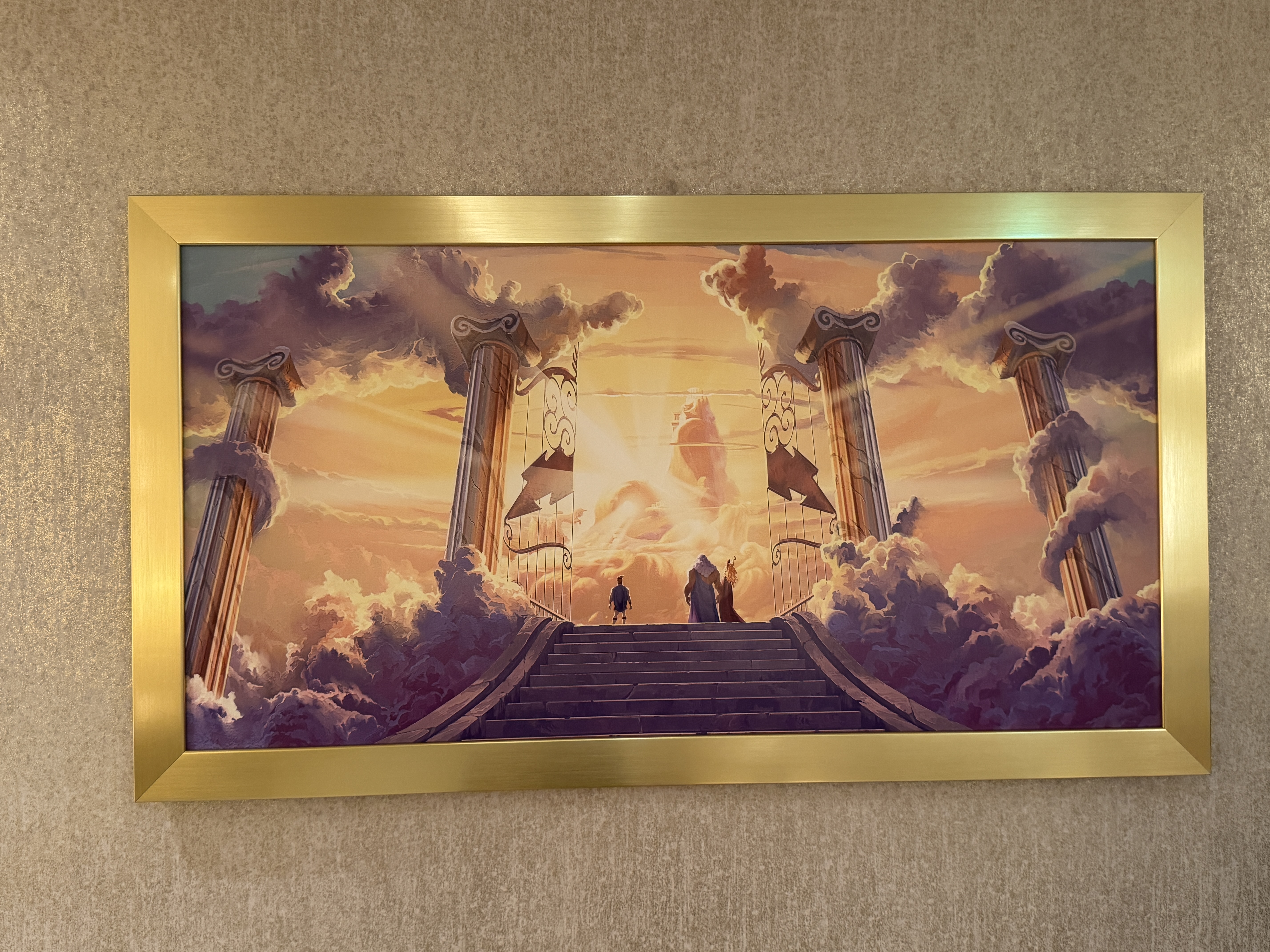 The walls are adorned with artwork depicting Mount Olympus, including a piece showing Hercules and Pegasus flying before the sun, and another of the young hero with Zeus and Hera at the gates.