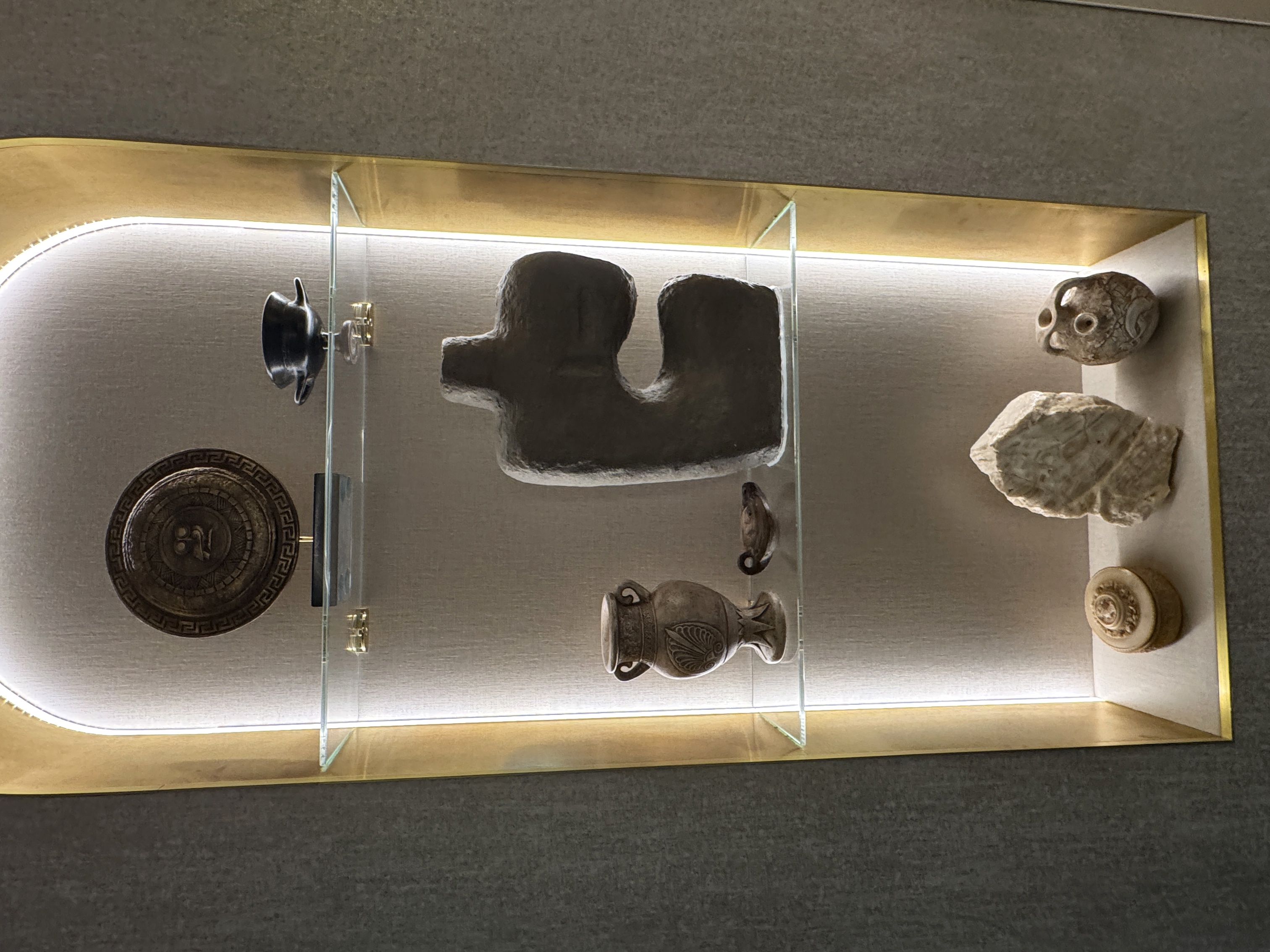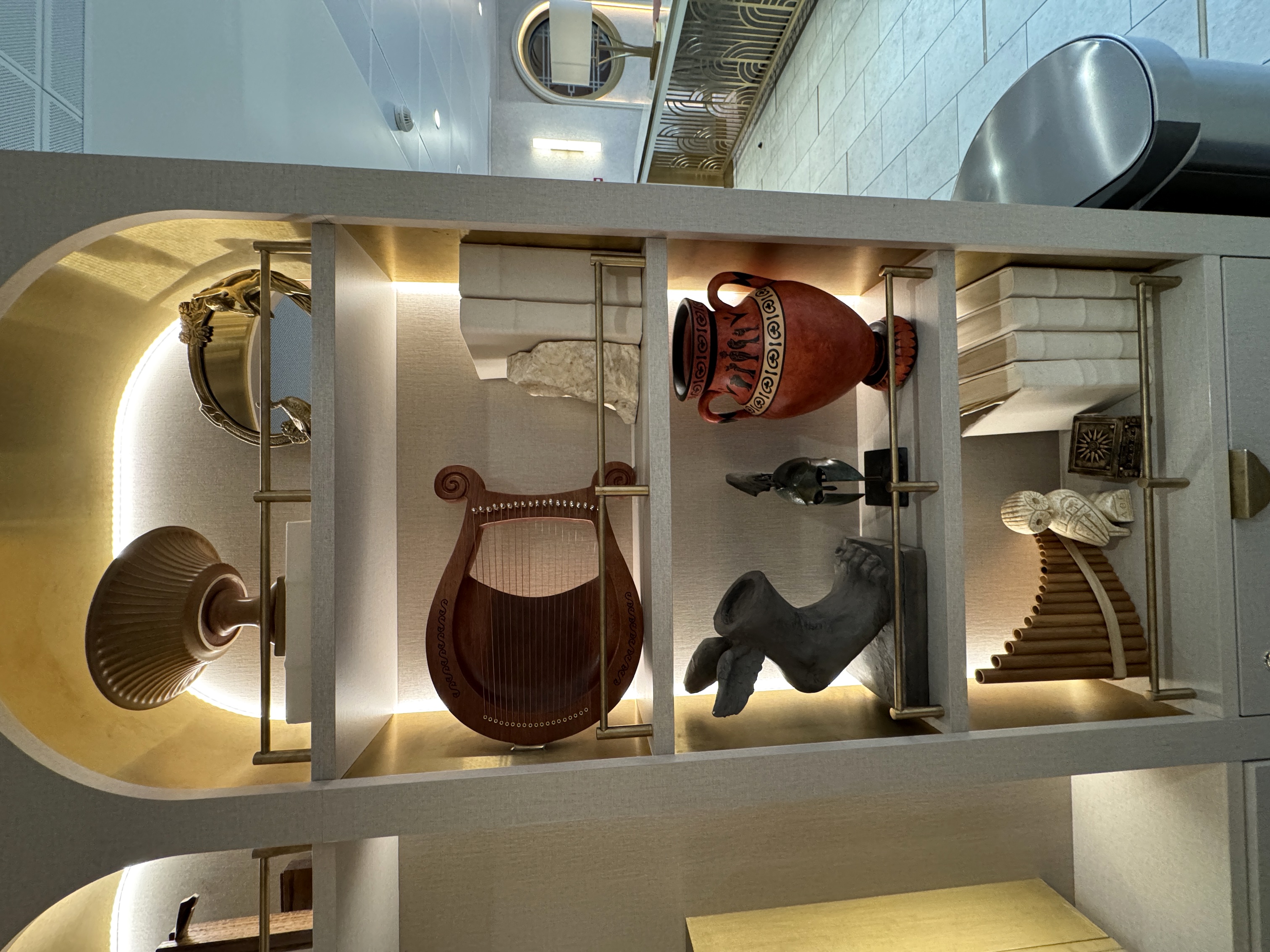 The space is designed to feel like the top of Mount Olympus, featuring white walls with golden inset lights, Grecian-style columns, and a large circular skylight.