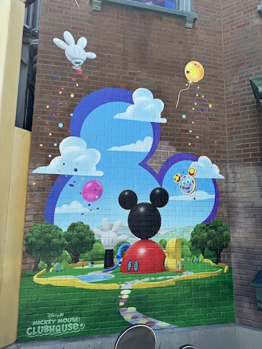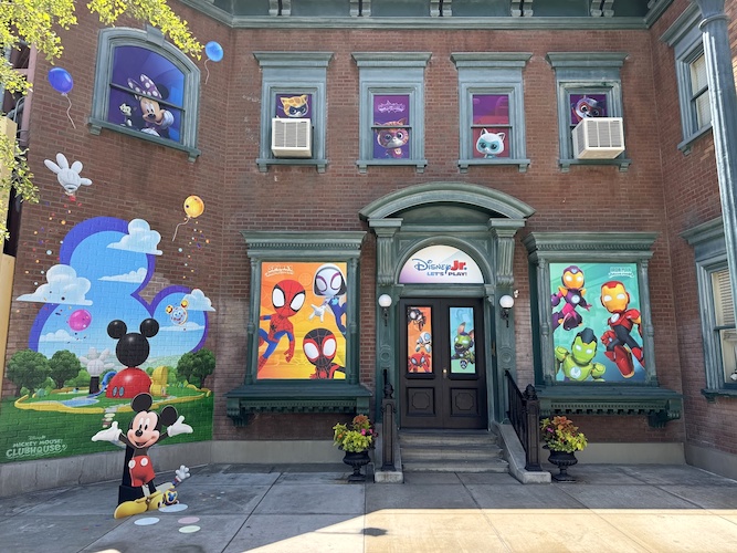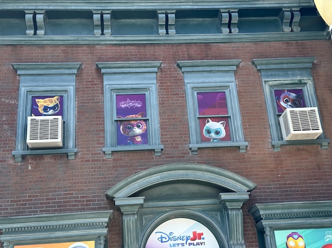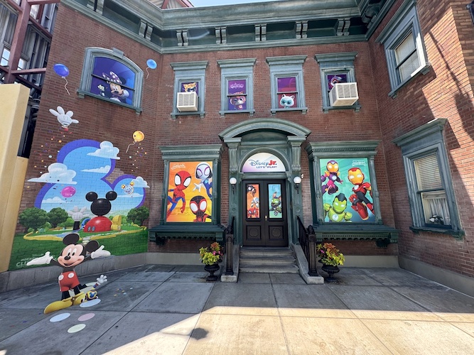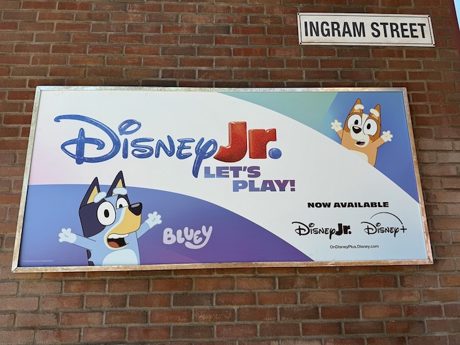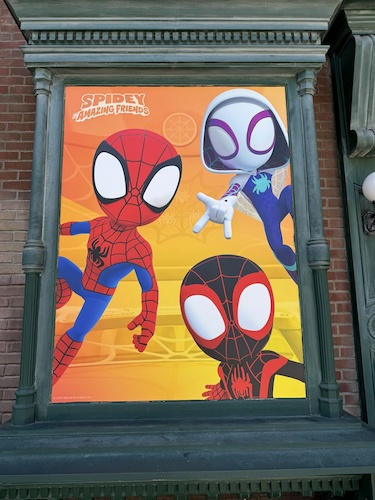 Taking a look at the street facade with its new look, you’ll notice more than just the Bluey billboard, but also decor featuring the casts of Superkitties, Marvel’s Spidey and His Amazing Friends, Marvel’s Iron Man and His Awesome Friends, the new Mickey Mouse Clubhouse+,