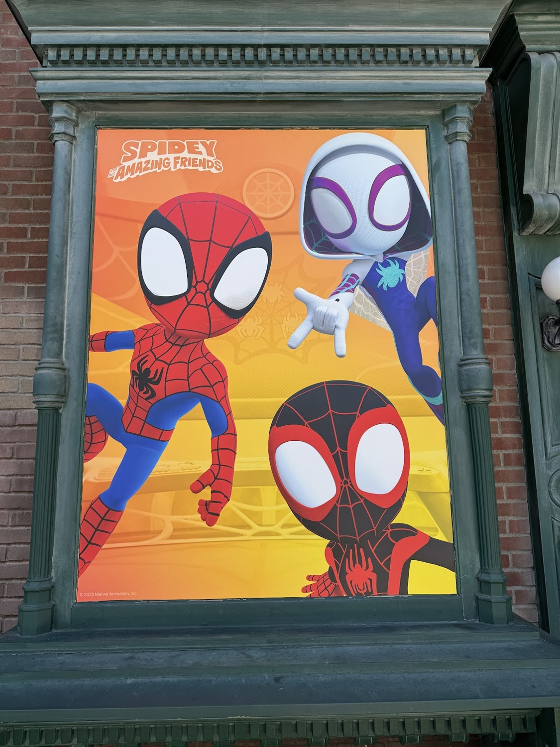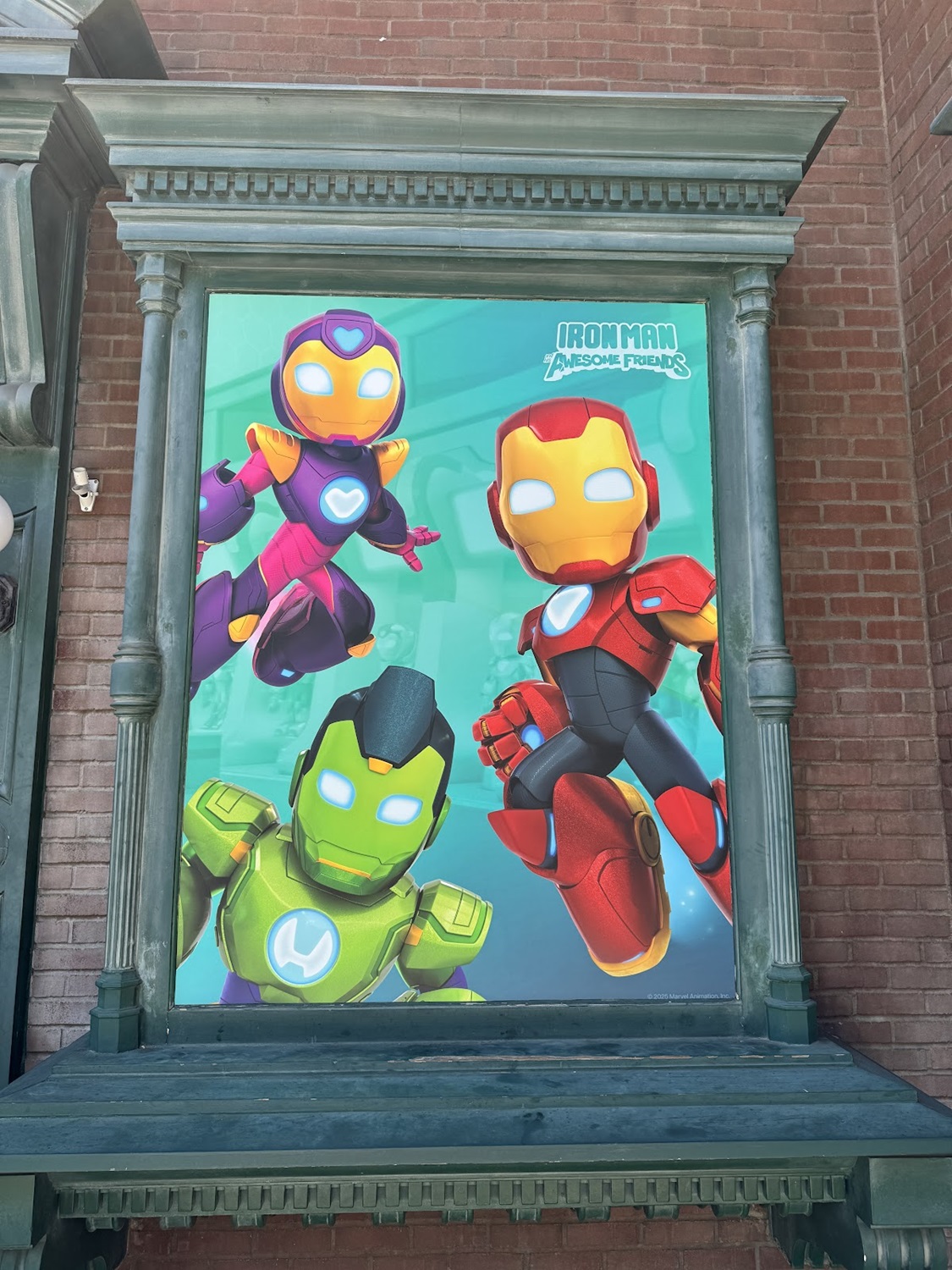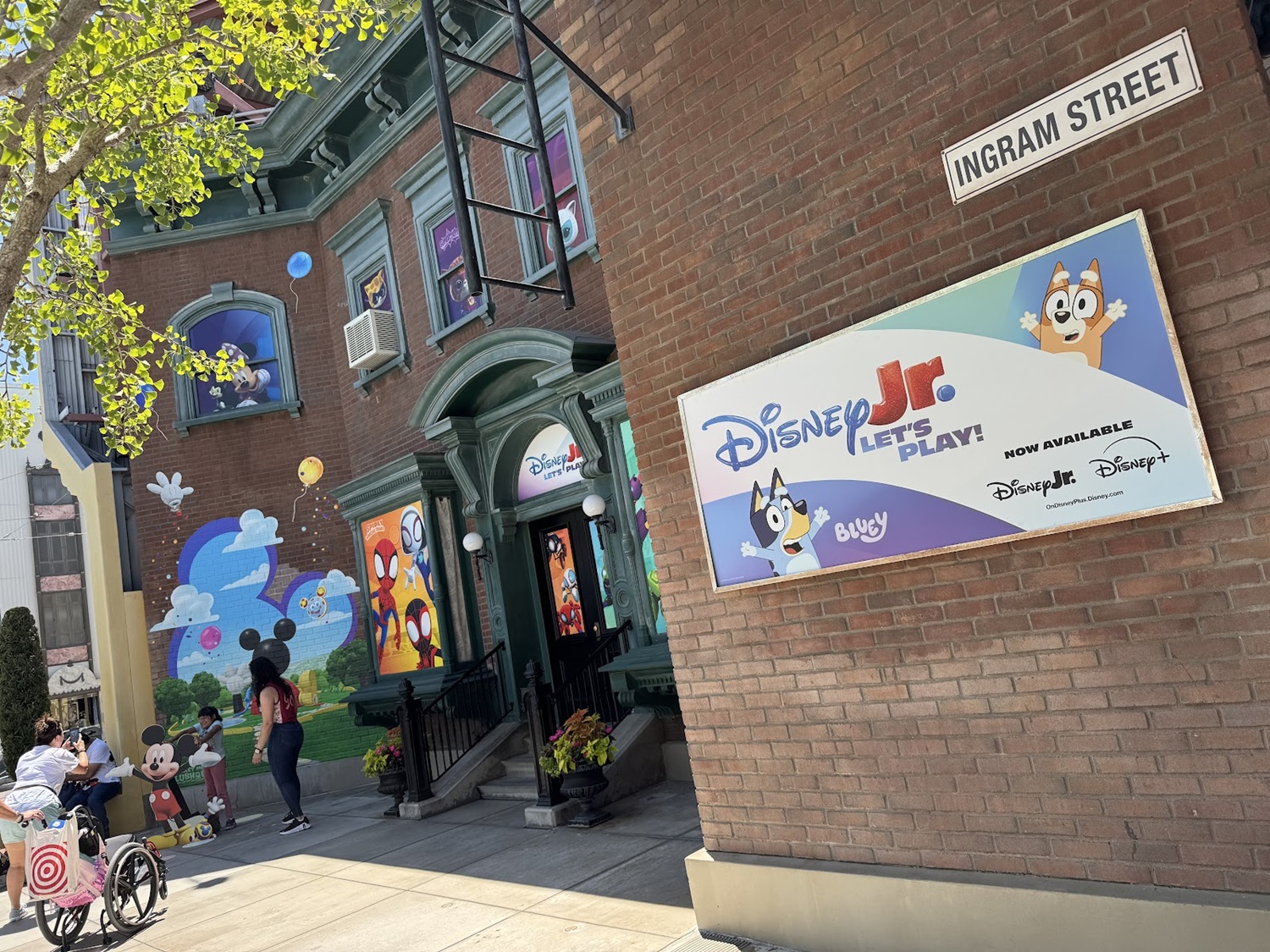 Taking a look at the street facade with its new look, you’ll notice more than just the Bluey billboard, but also decor featuring the casts of Superkitties, Marvel’s Spidey and His Amazing Friends, Marvel’s Iron Man and His Awesome Friends, the new Mickey Mouse Clubhouse+,
