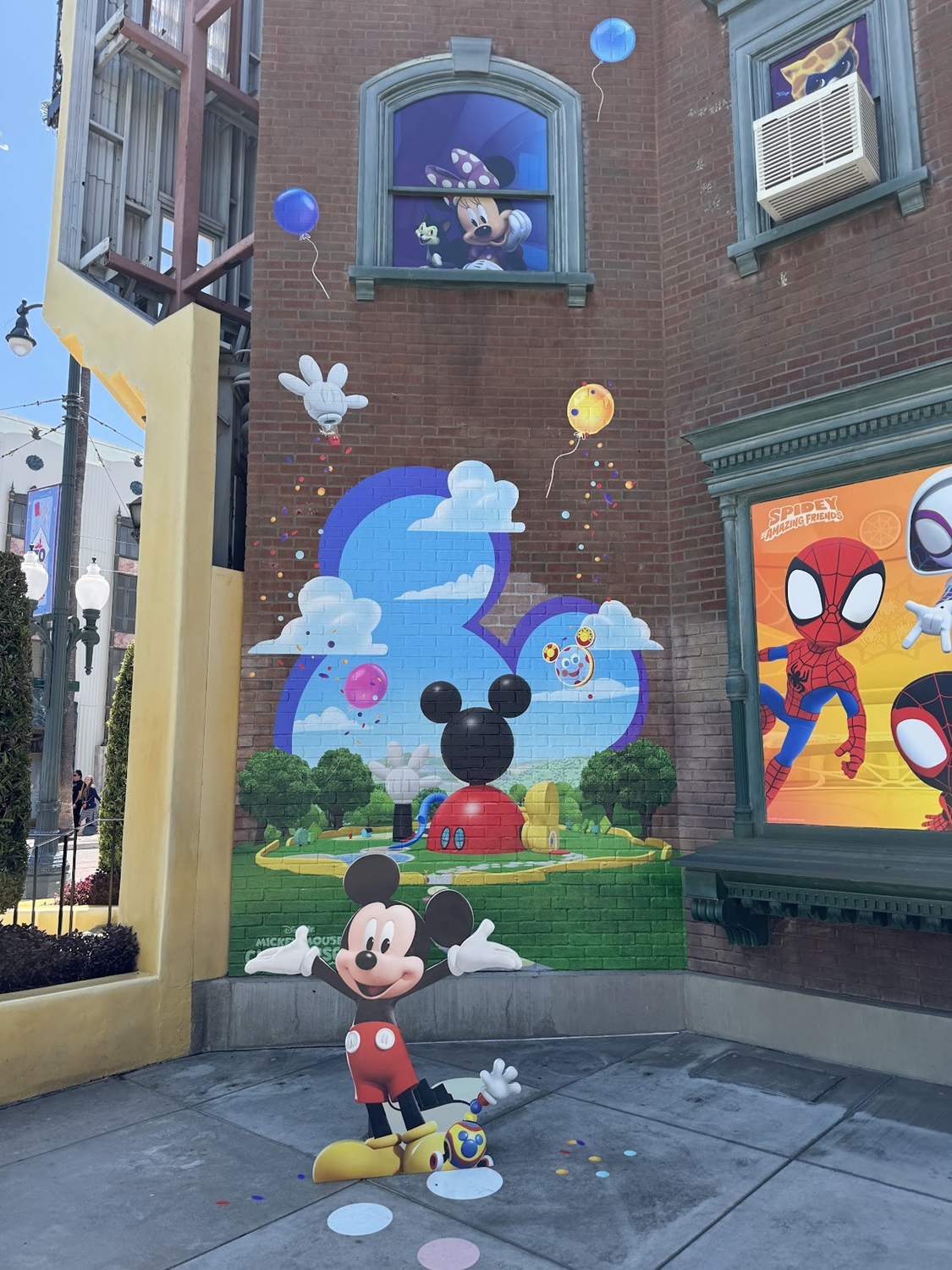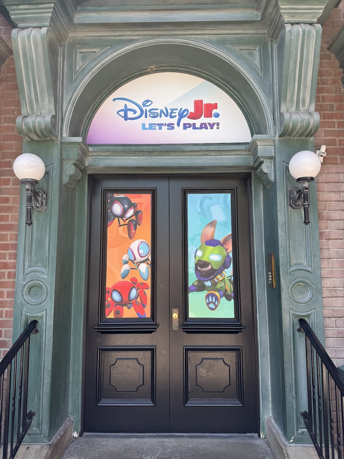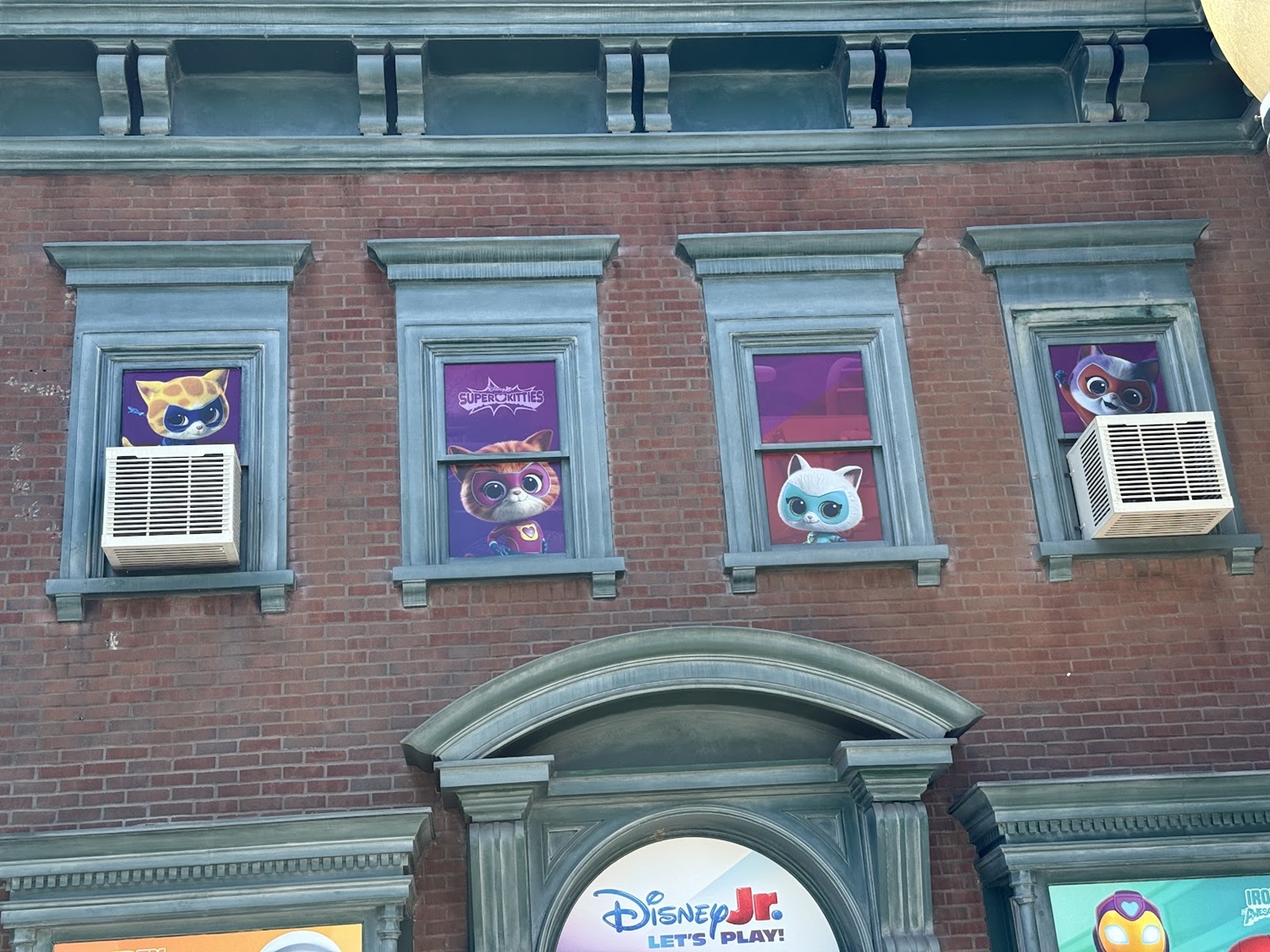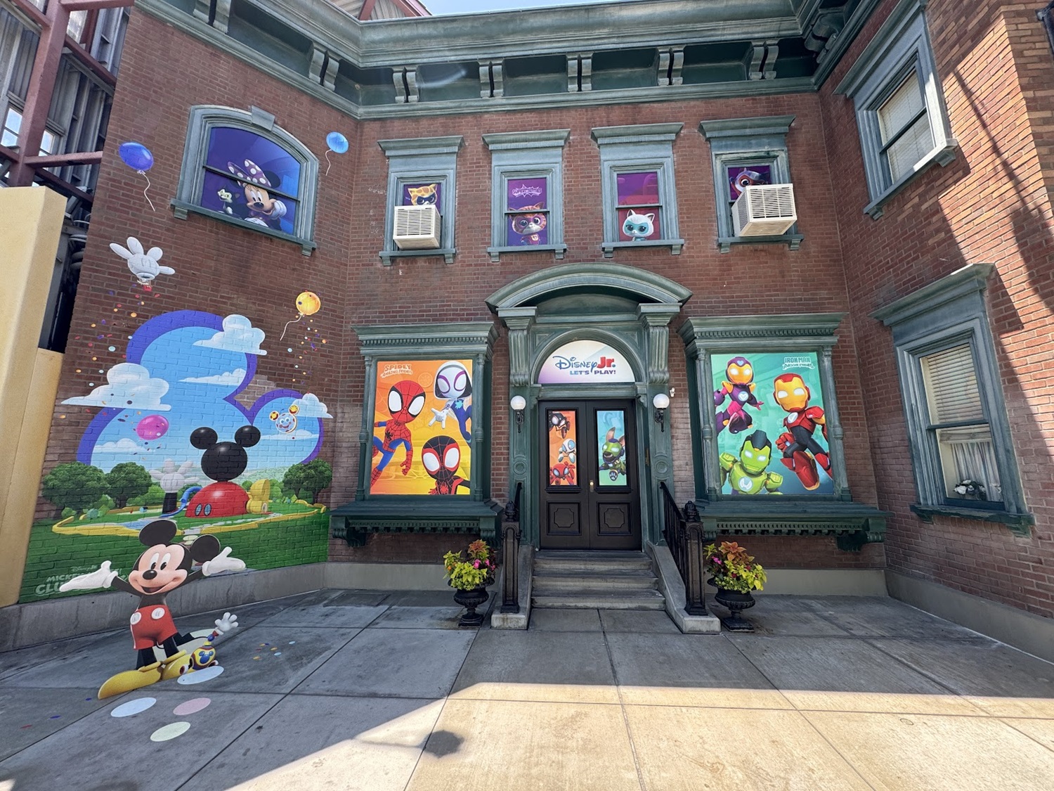 Taking a look at the street facade with its new look, you’ll notice more than just the Bluey billboard, but also decor featuring the casts of Superkitties, Marvel’s Spidey and His Amazing Friends, Marvel’s Iron Man and His Awesome Friends, the new Mickey Mouse Clubhouse+,