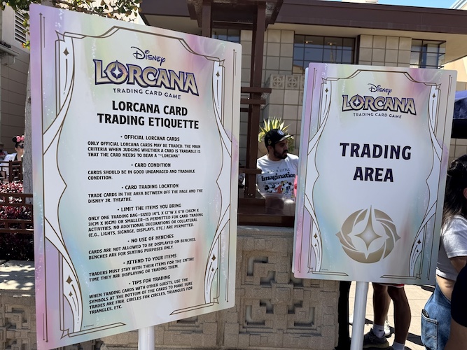While the main event is a special collection quest that will lead them into the former Beast’s Library of the Disney Animation building in Hollywoodland, guests visiting the park will see the Disney Lorcana presence as soon as they get into this area of the park. Just past the Disney Theater, fans will find an area to play and trade, as well as kiosks where they can purchase additional expansions and sets. There are also a handy set of etiquette tips since the quest also encourages trading with other players.