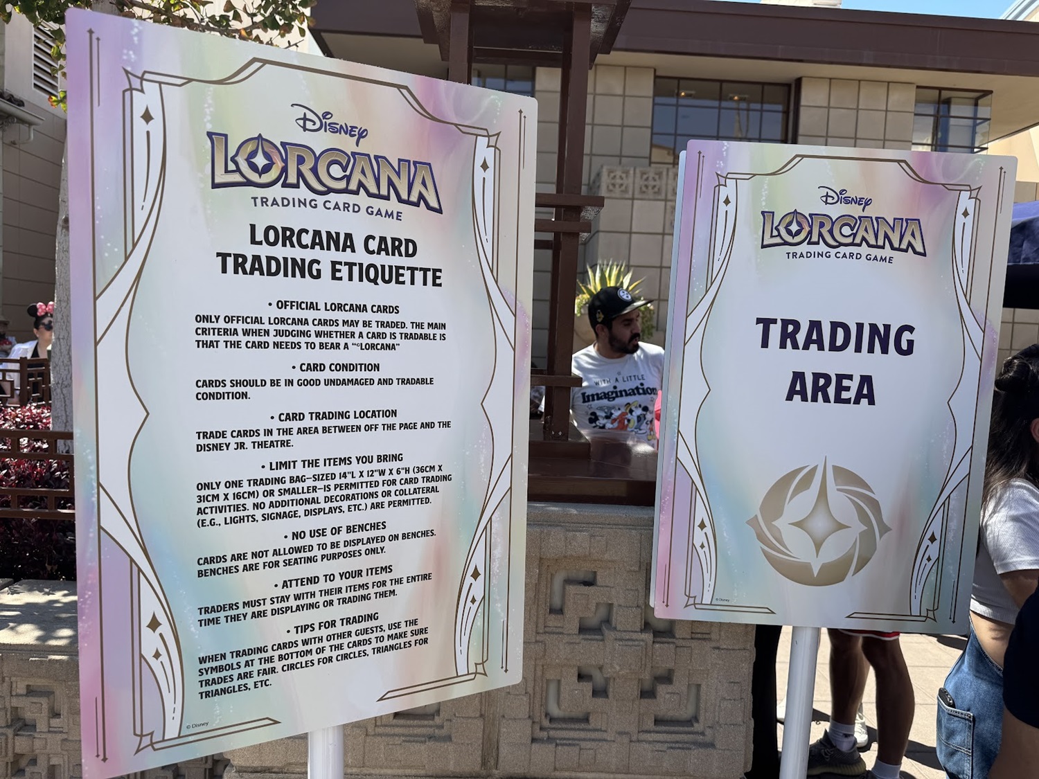 While the main event is a special collection quest that will lead them into the former Beast’s Library of the Disney Animation building in Hollywoodland, guests visiting the park will see the Disney Lorcana presence as soon as they get into this area of the park. Just past the Disney Theater, fans will find an area to play and trade, as well as kiosks where they can purchase additional expansions and sets. There are also a handy set of etiquette tips since the quest also encourages trading with other players.