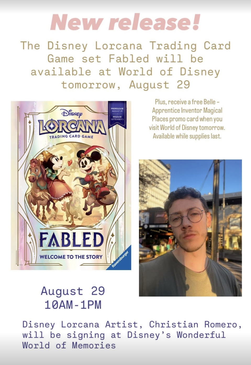 - From 10:00 a.m. to 1:00 p.m., Disney Lorcana artist Christian Romero will be hosting a signing event at Disney’s Wonderful World of Memories.