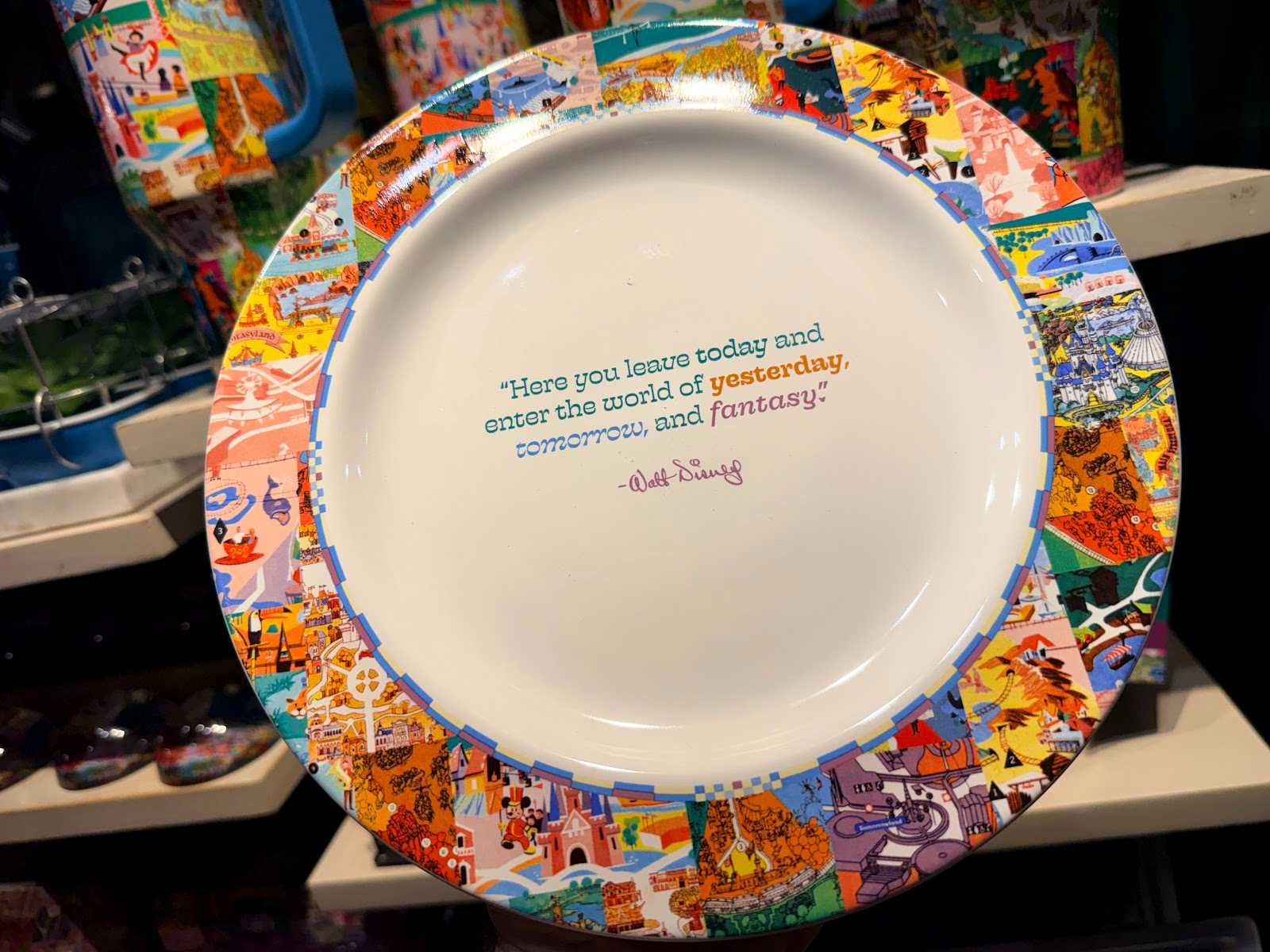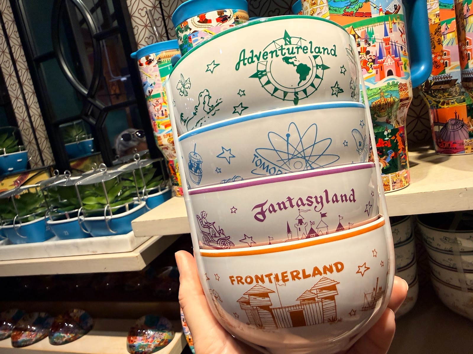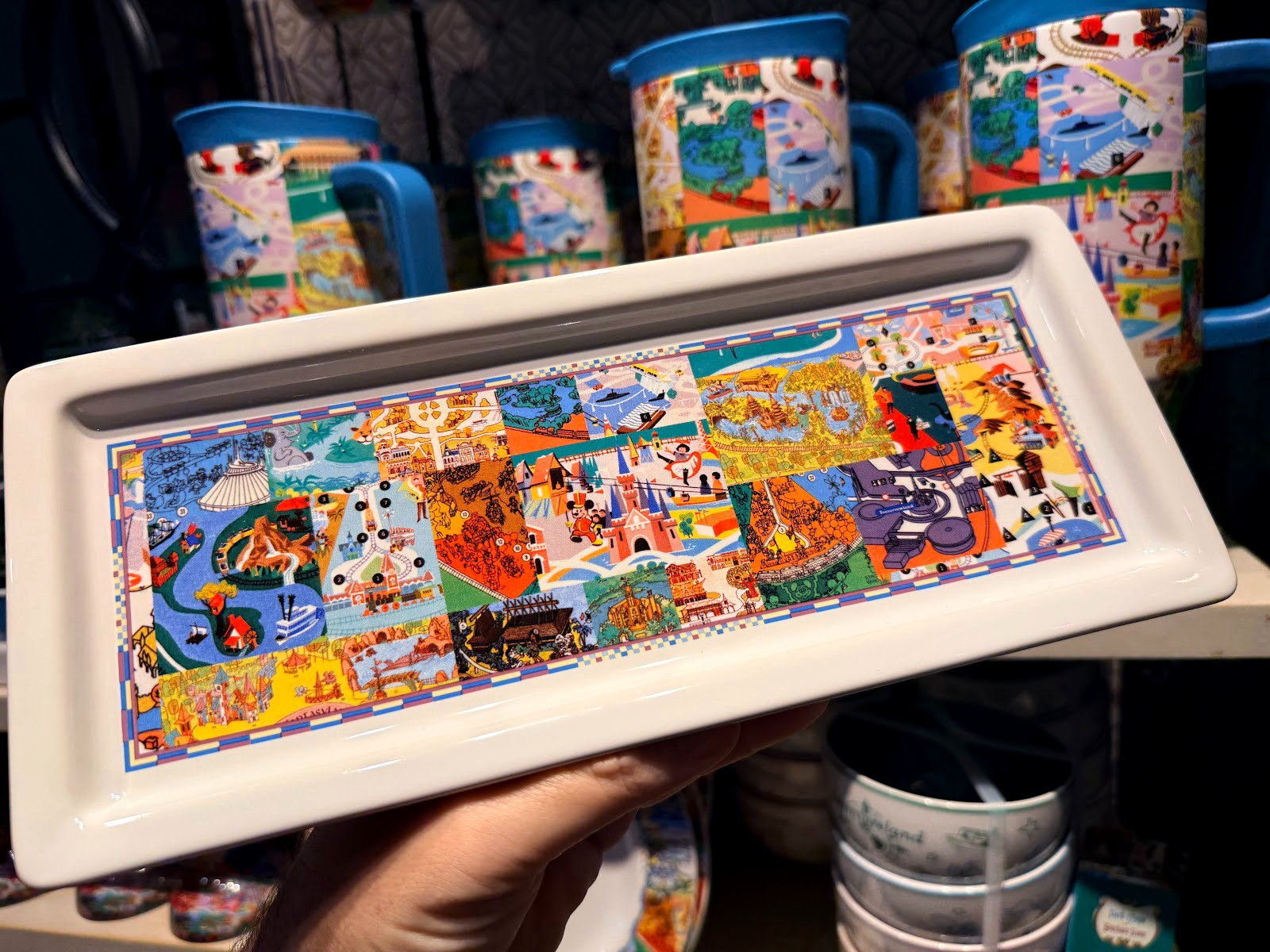 A set of bowls represents each of the original lands at Disneyland - Fantasyland, Frontierland, Tomorrowland, and Adventureland - while the map art carries over to various plates and dishes. The bowls retail $49.99, while the single serving plate goes for $16.99, with the larger rectangular dish for $29.99