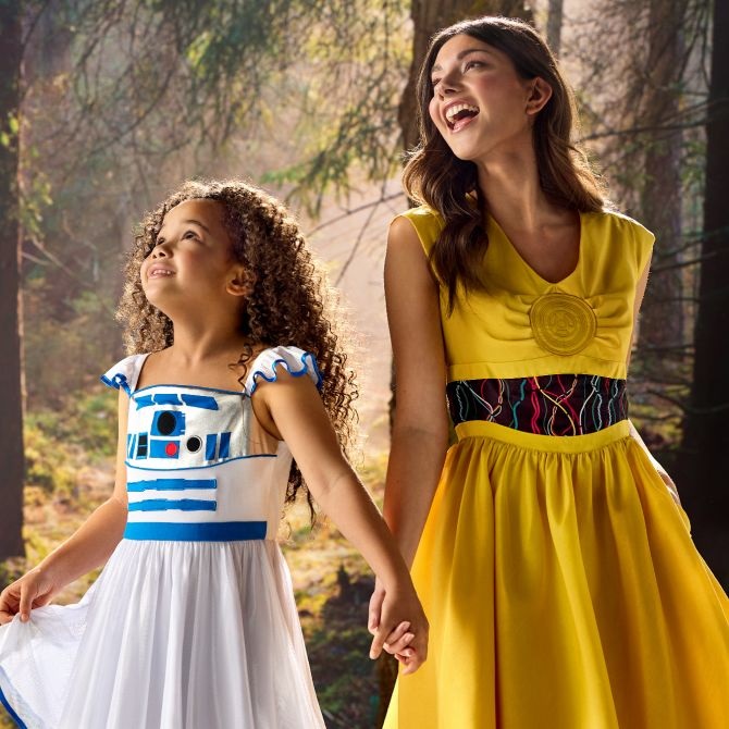 - Fans young and young at heart will delight in the dress styles inspired by droids R2-D2 and C-3PO. For girls, there’s a sleeveless R2 dress that’s part of the Story Play line. This look resembles the key markings and esthetic of the trusty companion.