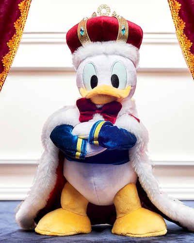 - As for the plush, there are two distinct pals to add to your collection. One features a proud Donald complete with a crown (he’s the king) and cape. For added attitude, he’s got his arms crossing his chest in a very, “I’m the boss pose."