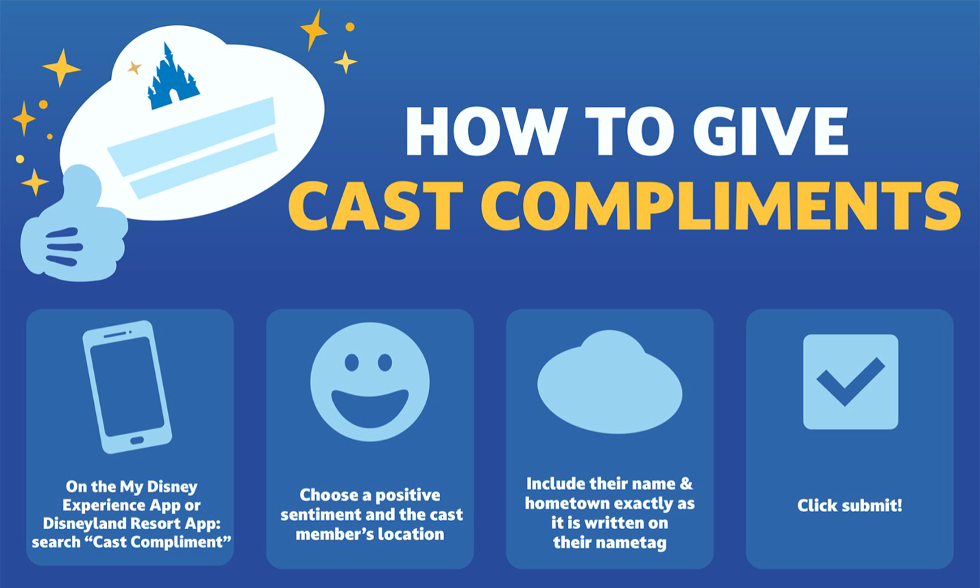 - Mobile Cast Compliments is a feature in the My Disney Experience and Disneyland Resort apps that allows guests to send a heartfelt thank you to cast members.