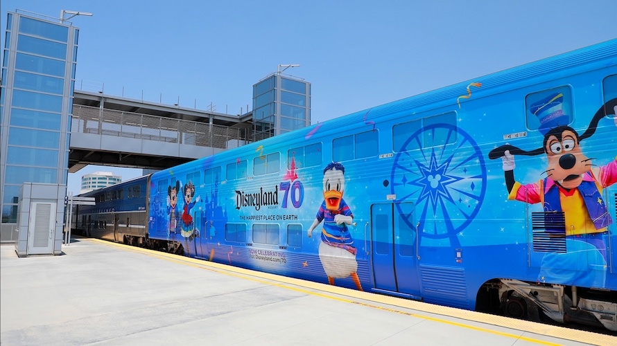 Amtrak is celebrating Disneyland’s 70th anniversary with a whimsical limited-time train wrap rolling down the Southern California coast.