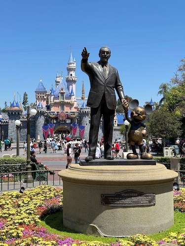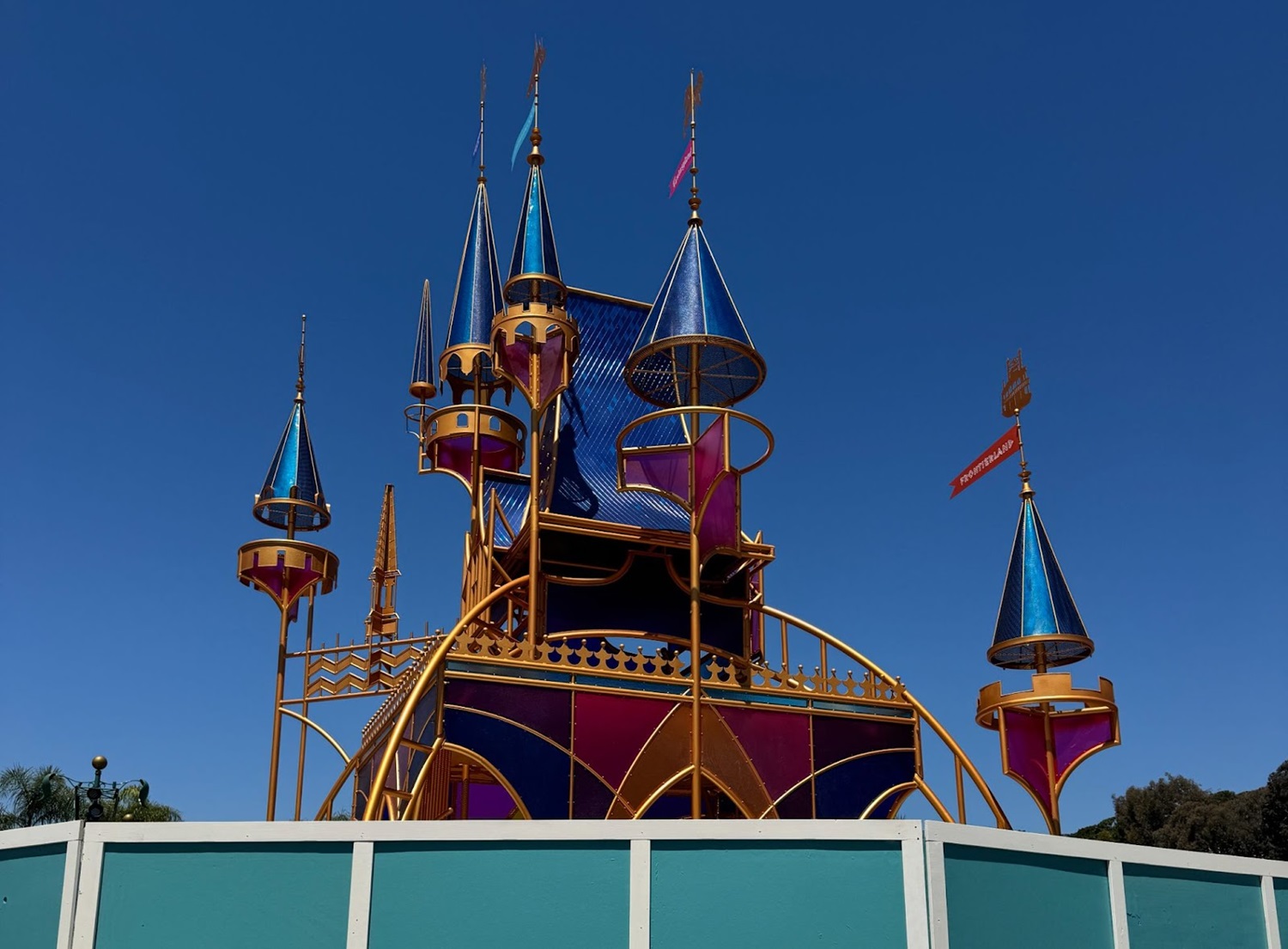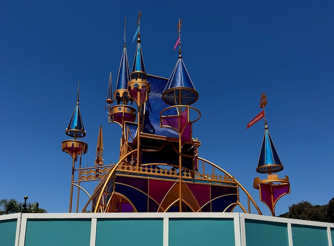 Starting off in the Esplanade between Disneyland and Disney California Adventure, is this new 50-foot tall sculpture inspired by Sleeping Beauty Castle, with colorful glass panels and golden charms representing Disneyland’s five original lands.