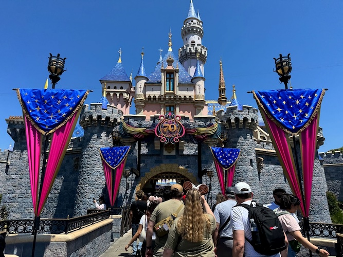 Since we reported on the installation of the Disneyland 70 medallion on Sleeping Beauty Castle, the 70th banners leading up to the Castle have now also been installed.