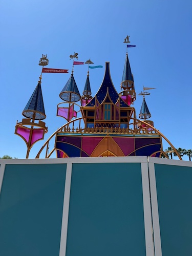 In the heart of Town Square, you’ll spot an installation that will feature Mickey and Minnie, created just for the anniversary. So far, just the backdrop of the photo op has been installed.