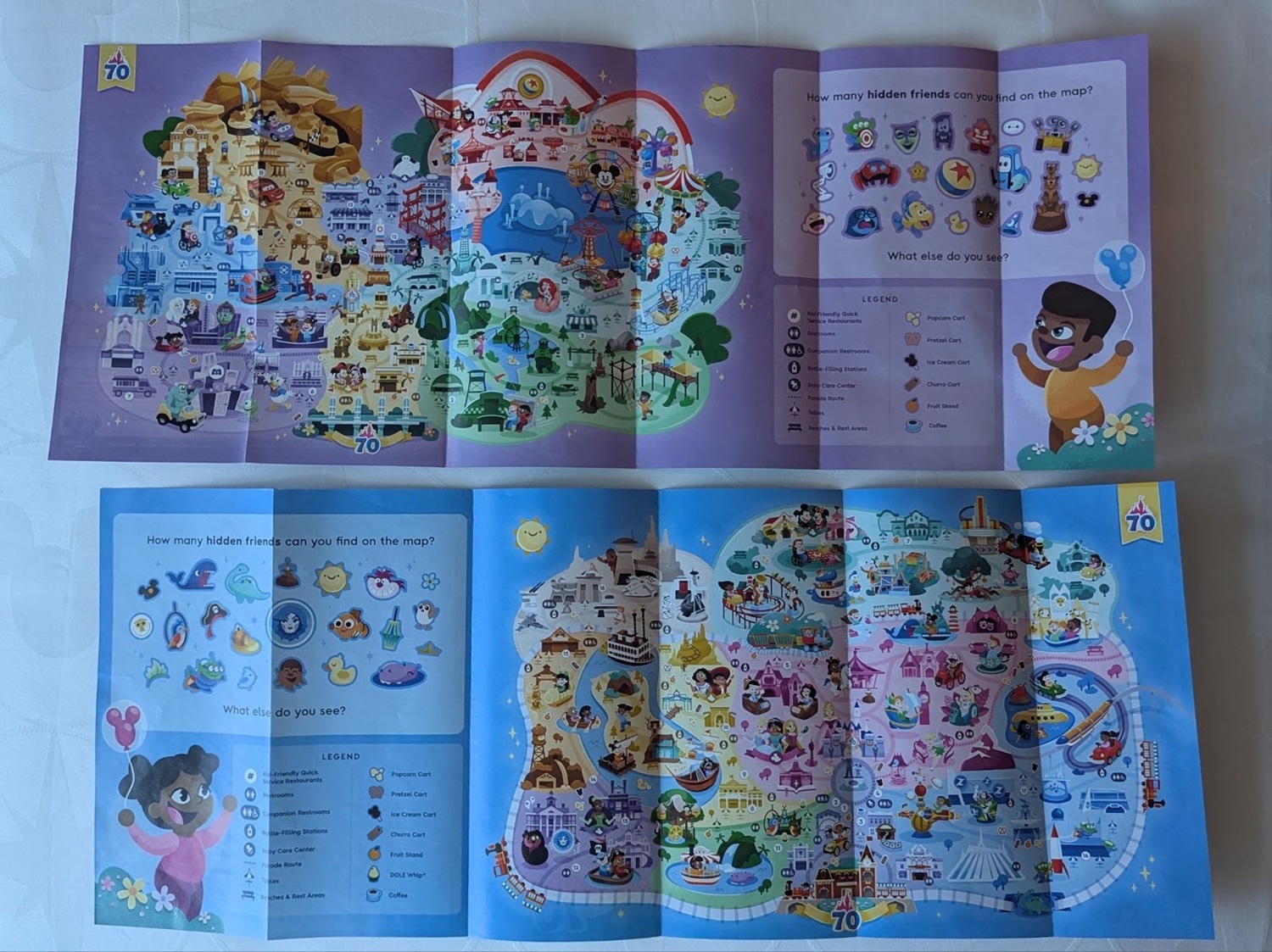 The maps themselves are equally as stylized, with some hidden friends to spot, as well as highlighting some of the family friendly attractions in both parks.
