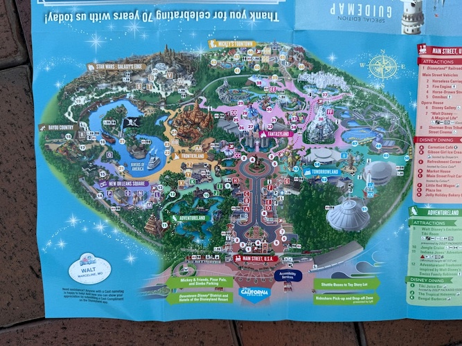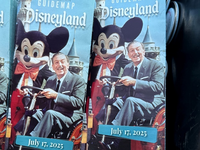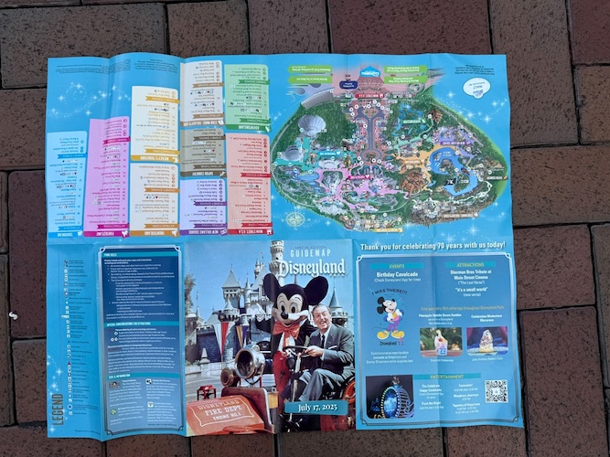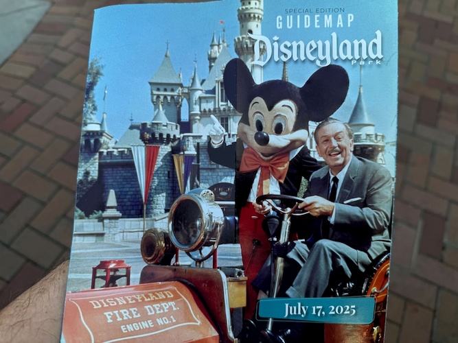 Today is the big day – the 70th anniversary of Disneyland! Similar to milestone anniversaries in the past, a special park guidemap is available to guests entering the park today. On the cover, guests will find a picture of Walt Disney in the fire truck at Disneyland alongside Mickey Mouse, a classic picture that many fans know and love.