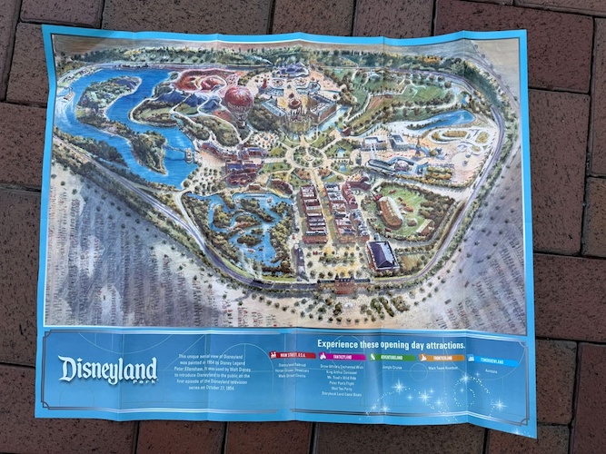 If you completely unfold the map, you’ll be treated to the rendering of Disneyland by Peter Ellenshaw that was used to introduce the park to the public in the 1954 debut of the Disneyland television show. Beneath it, a list of opening day attractions for guests to experience at the park to celebrate today.