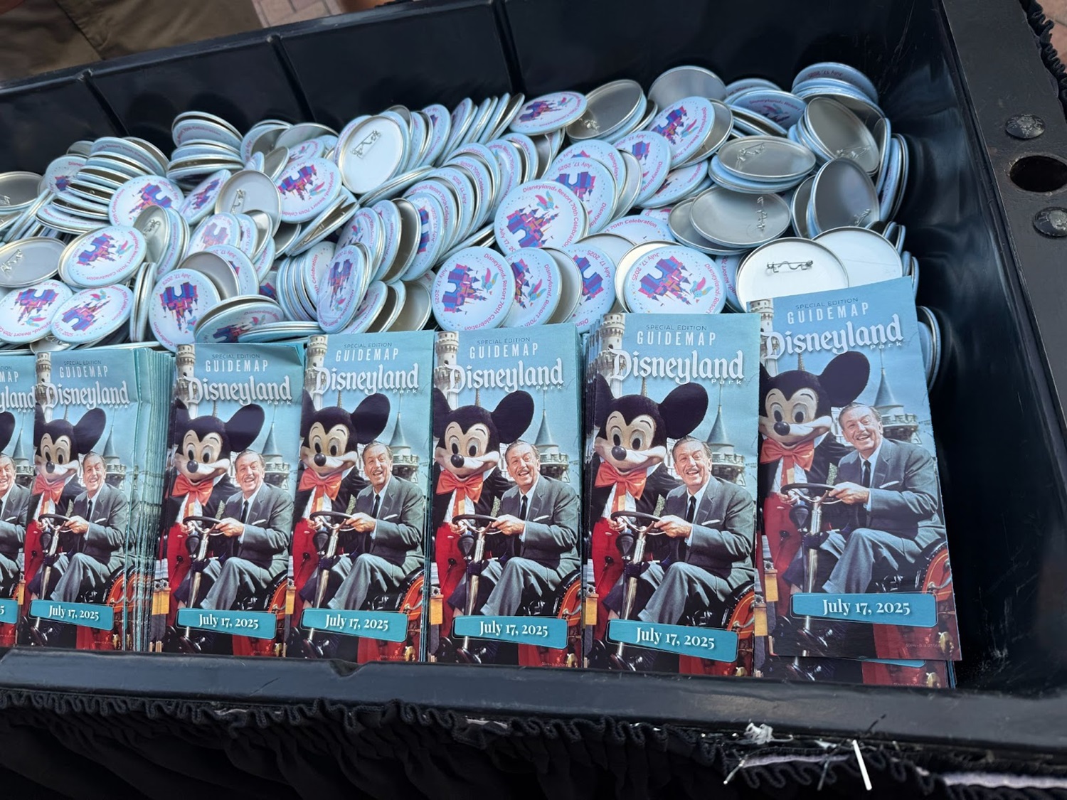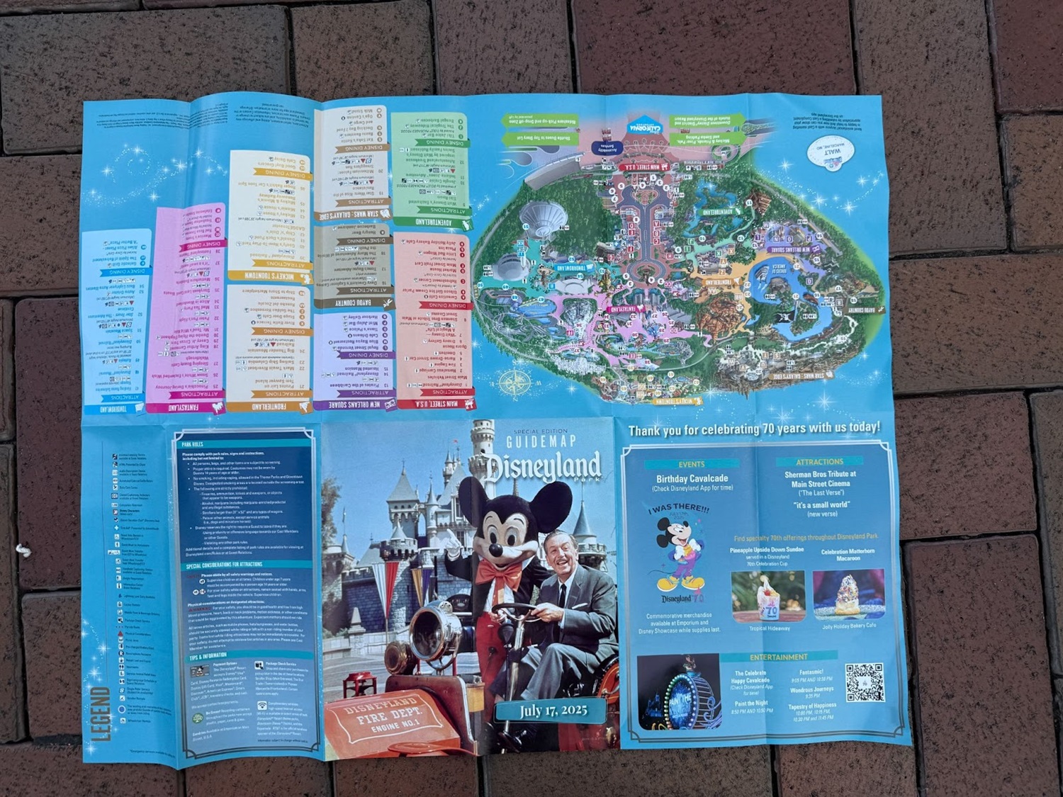 Today is the big day – the 70th anniversary of Disneyland! Similar to milestone anniversaries in the past, a special park guidemap is available to guests entering the park today. On the cover, guests will find a picture of Walt Disney in the fire truck at Disneyland alongside Mickey Mouse, a classic picture that many fans know and love.