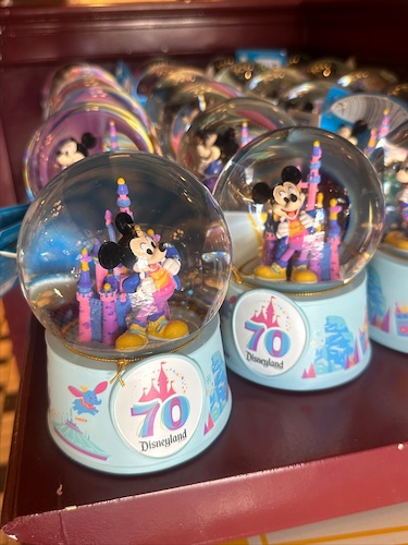 The Celebration Collection takes classic Disney Parks styles and adds bold colors, new character art, and designs inspired by Disneyland Resort attractions. At Disneyana, the only items found from this collection were the 70th Anniversary Snow Globes, available in a small and large size. The smaller retails for $39.99 with the more ornate large variation retailing for $149.99.