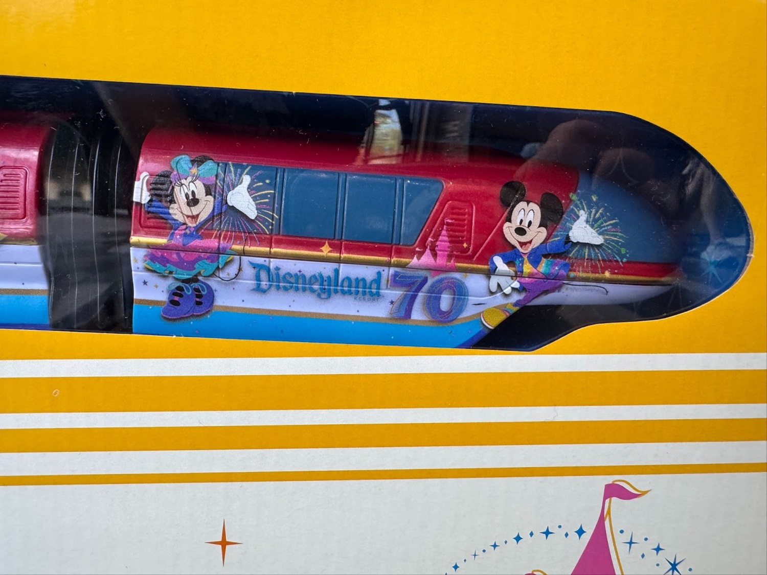 The collectible features one of the Disneyland 70th wrapped monorails.