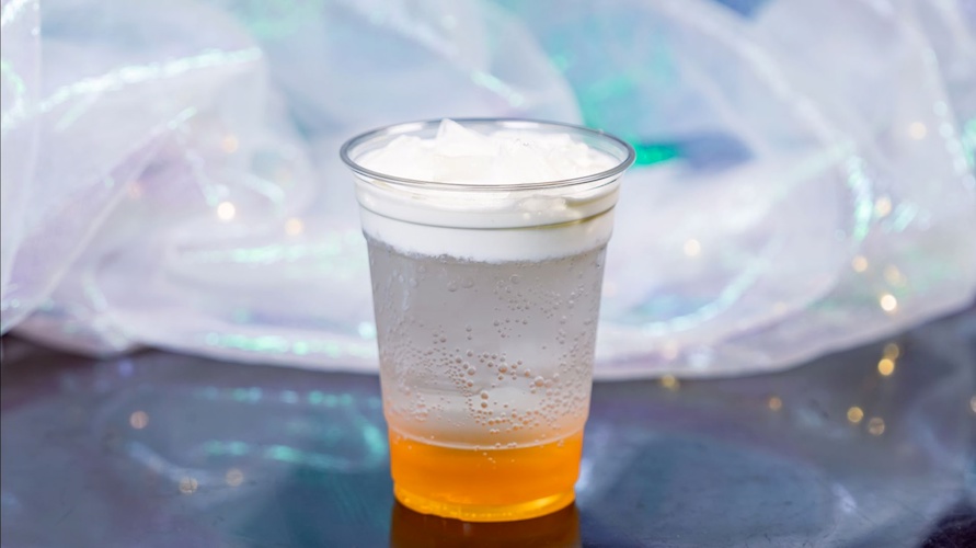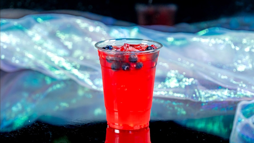 - Peach and Watermelon Slushy: Peach and watermelon-layered slushy garnished with a watermelon wedge and mint (Non-alcoholic beverage) (New) (Available with Mickey-shaped Glow Cube)