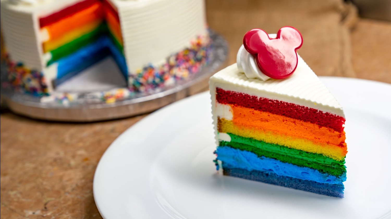 - Rainbow Layer Cake: Layers of multicolored cake and mousse buttercream topped with a Mickey Mouse chocolate decoration